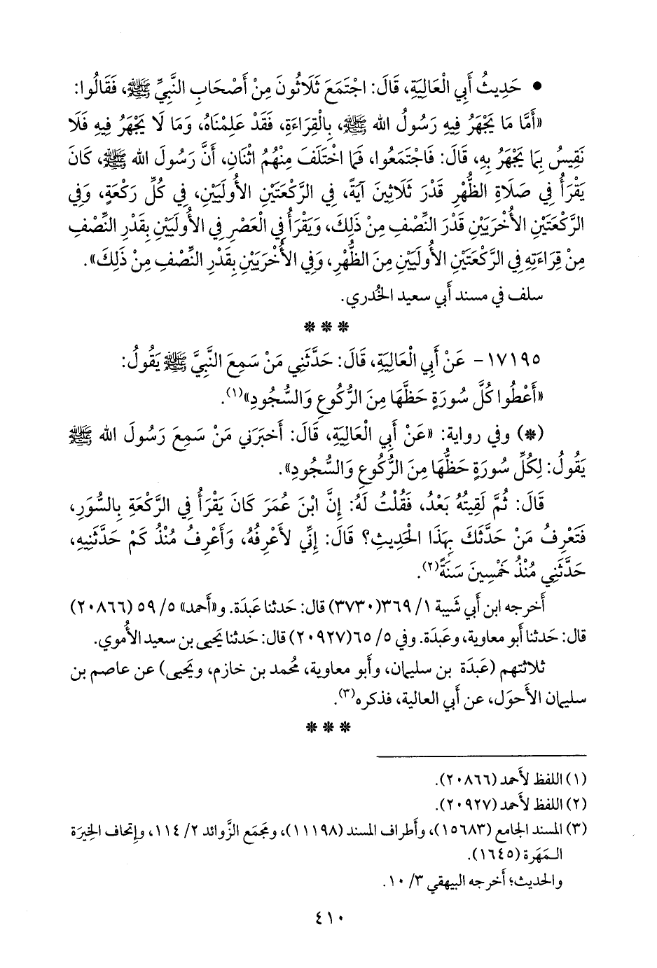 - وفي رواية: «عن أبي العالية، قال: أخبرني من سمع رسول الله صَلى الله عَليه وسَلم يقول: لكل سورة حظها من الركوع والسجود».