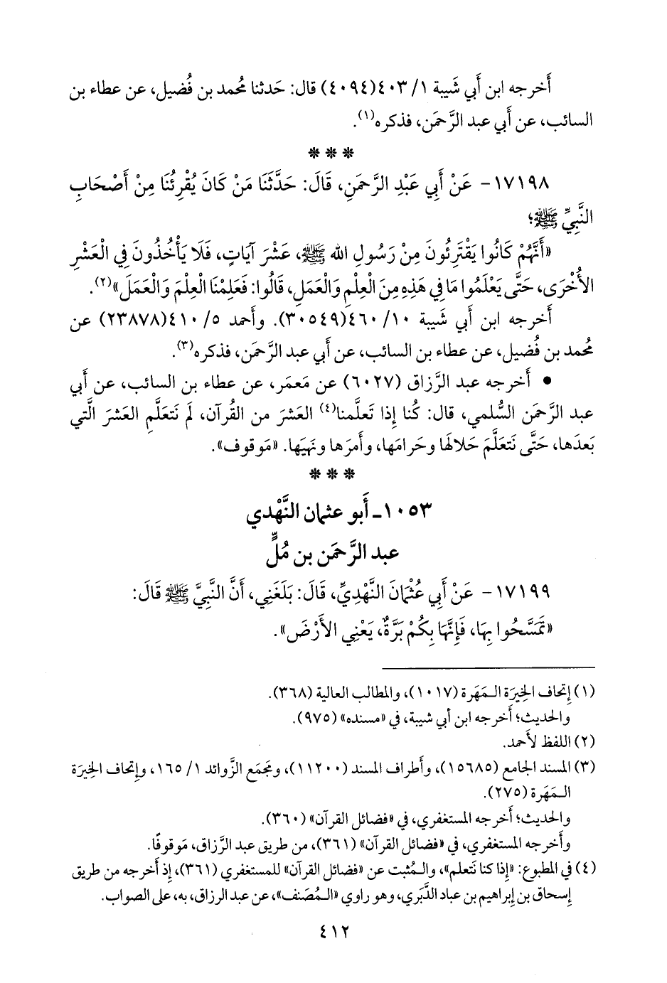 • أَخرجه عبد الرزاق (٦٠٢٧) عن مَعمَر، عن عطاء بن السائب، عن أبي عبد الرَّحمَن السُّلَمي، قال: كنا إذا تعلمنا (¬٣) العشر من القرآن، لم نتعلم العشر التي بعدها، حتى نتعلم حلالها وحرامها، وأمرها ونهيها. «موقوف».