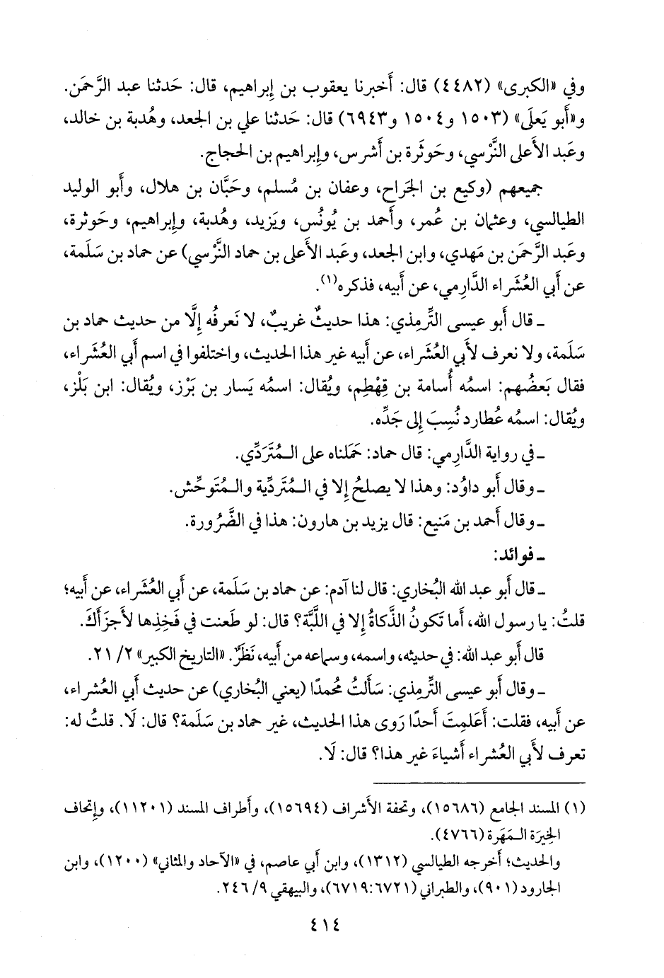 - وقال التِّرمِذي: سألتُ محمدًا، يعني ابن إسماعيل البخاري، عن حديث أبي العشراء، عن أبيه، فقلت: أعلمت أحدا روى هذا الحديث، غير حماد بن سلمة؟ قال: لا. قلت له: تعرف لأبي العشراء أشياء غير هذا؟ قال: لا.