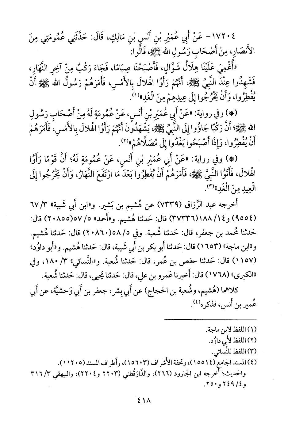 - وفي رواية: «عن أبي عمير بن أنس، عن عمومة له؛ أن قوما رأوا الهلال، فأتوا النبي صَلى الله عَليه وسَلم فأمرهم أن يفطروا بعد ما ارتفع النهار، وأن يخرجوا إلى العيد من الغد» (¬٣).