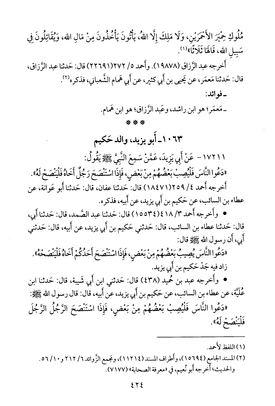(¬١) المسند الجامع (١٥٣٨٠ و ١٥٦٩٥)، وأطراف المسند (١١٢١٥)، ومَجمَع الزوائد ٤/ ٨٣، وإتحاف الخِيرَة المَهَرة (٢٧٤٨).