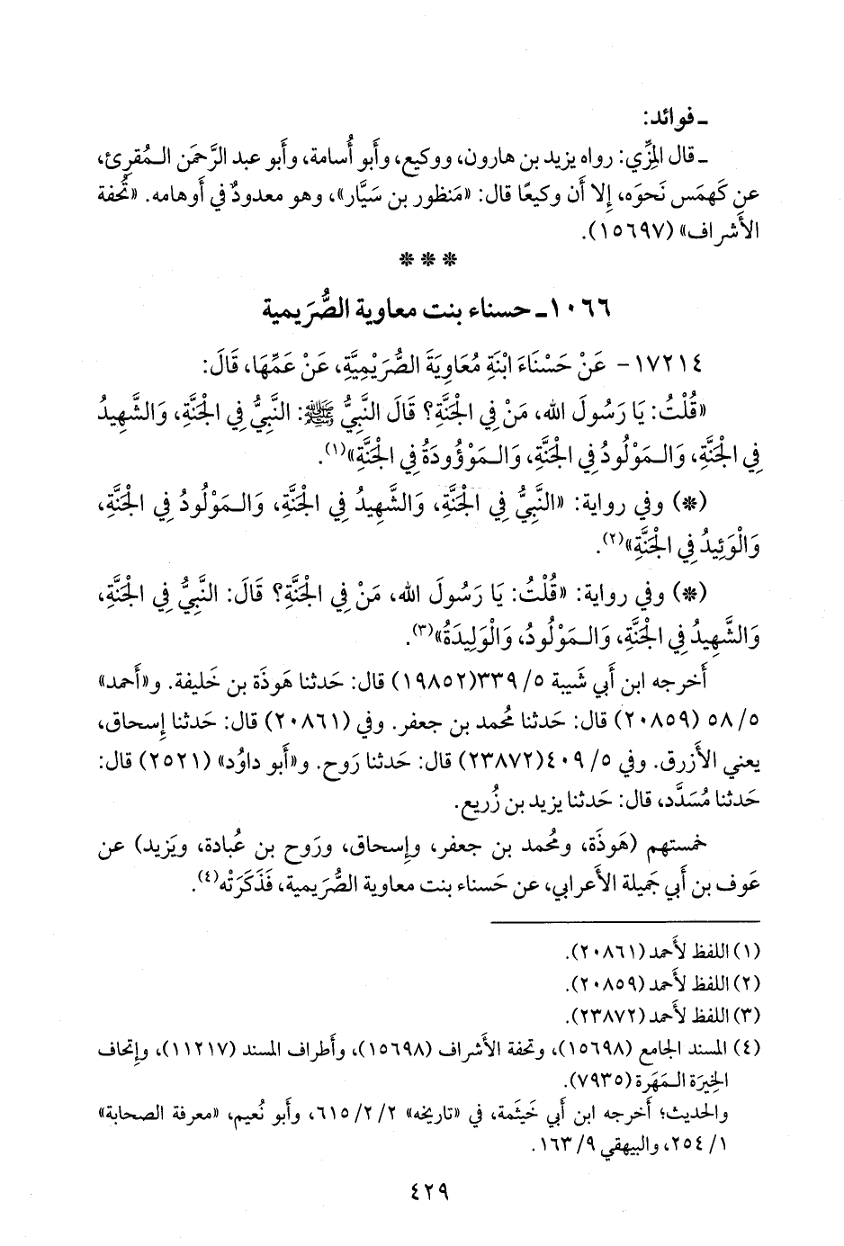 - وفي رواية: «عن حسناء امرأة من بني صريم، عن عمها، قال: سمعت رسول الله صَلى الله عَليه وسَلم يقول: النبي في الجنة، والشهيد في الجنة، والمولود في الجنة، والوئيد في الجنة» (¬٣).