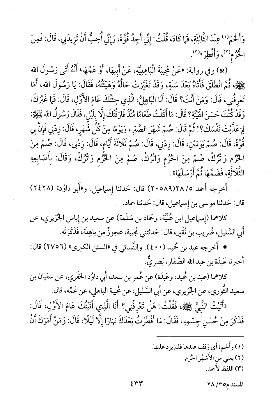 - وفي رواية: «عن مجيبة الباهلية، عن أبيها، أو عمها؛ أنه أتى رسول الله صَلى الله عَليه وسَلم ثم انطلق فأتاه بعد سنة، وقد تغيرت حاله وهيئته، فقال: يا رسول الله، أما تعرفني، قال: ومن أنت؟ قال: أنا الباهلي، الذي جئتك عام الأول، قال: فما غيرك، وقد كنت حسن الهيئة؟ قال: ما أكلت طعاما منذ فارقتك إلا بليل، فقال رسول الله صَلى الله عَليه وسَلم: لم عذبت نفسك؟! ثم قال: صم شهر الصبر، ويوما من كل شهر، قال: زدني فإن بي قوة، قال: صم يومين، قال: زدني، قال: صم ثلاثة أيام، قال: زدني، قال: صم من الحرم واترك، صم من الحرم واترك، صم من الحرم واترك، وقال: بأصابعه الثلاثة، فضمها ثم أرسلها».