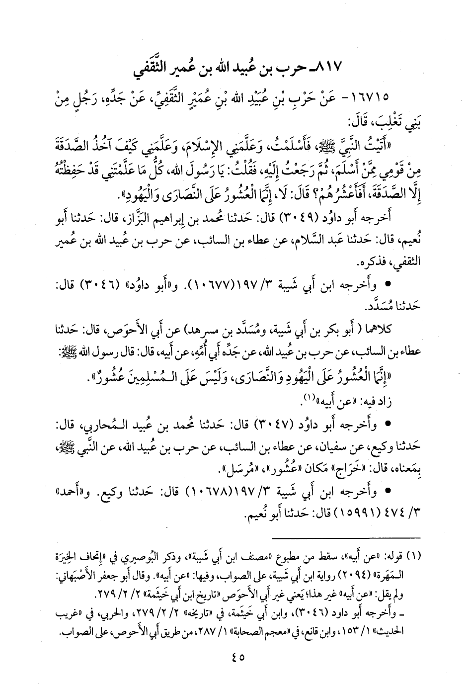 كلاهما (أَبو بكر بن أبي شيبة، ومُسَدَّد بن مسرهد) عن أبي الأحوص، قال: حدثنا عطاء بن السائب، عن حرب بن عُبيد الله، عن جَدِّه أبي أمه، عن أبيه، قال: قال رسول الله صَلى الله عَليه وسَلم: