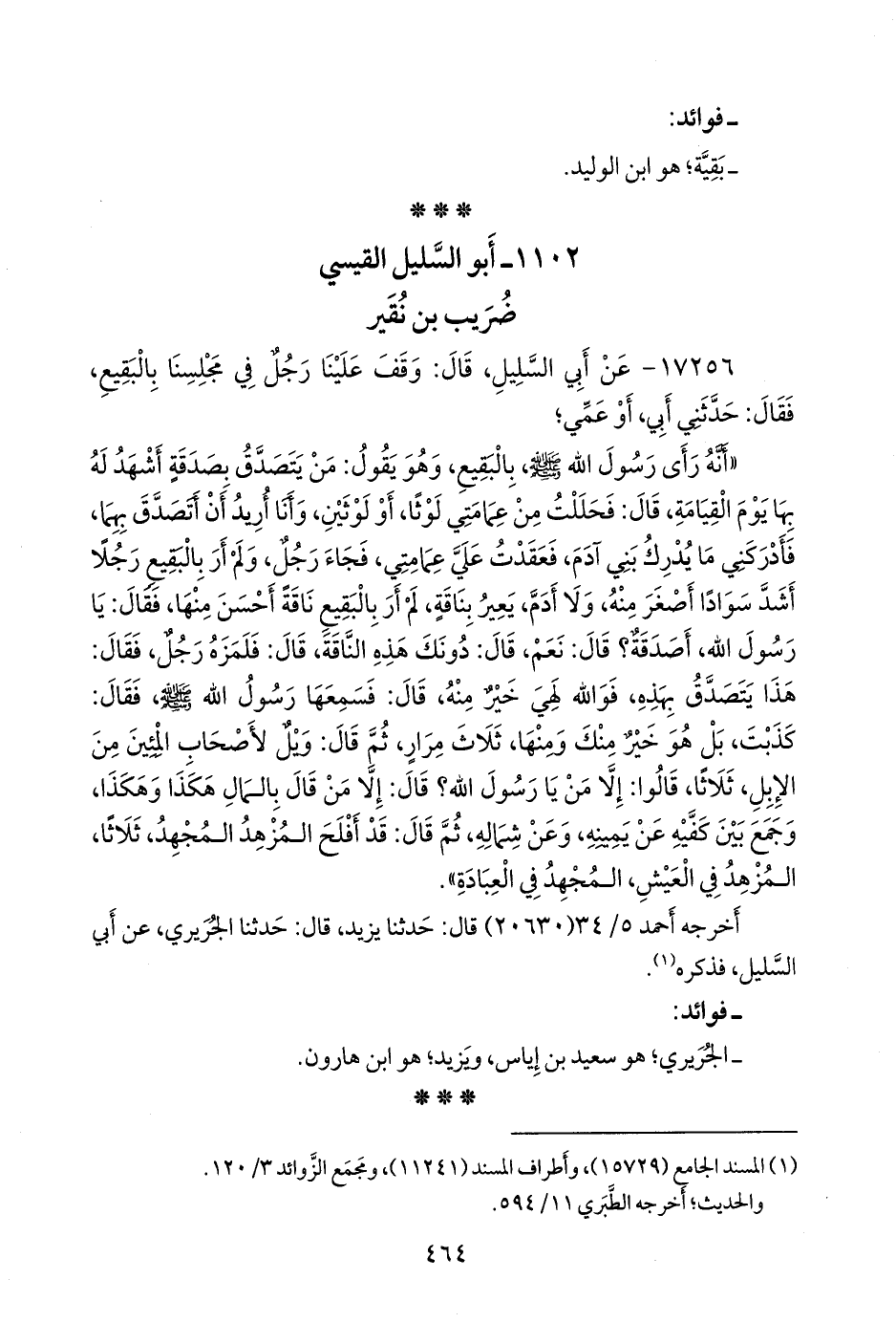 «أنه رأى رسول الله صَلى الله عَليه وسَلم بالبقيع، وهو يقول: من يتصدق بصدقة أشهد له بها يوم القيامة، قال: فحللت من عمامتي لوثا، أو لوثين، وأنا أريد أن أتصدق بهما، فأدركني ما يدرك بني آدم، فعقدت علي عمامتي، فجاء رجل، ولم أر بالبقيع رجلا أشد سوادا أصغر منه، ولا أدم، يعير بناقة، لم أر بالبقيع ناقة أحسن منها، فقال: يا رسول الله، أصدقة؟ قال: نعم، قال: دونك هذه الناقة، قال: فلمزه رجل، فقال: هذا يتصدق بهذه، فوالله لهي خير منه، قال: فسمعها رسول الله صَلى الله عَليه وسَلم فقال: كذبت، بل هو خير منك ومنها، ثلاث مرار، ثم قال: ويل لأصحاب المئين من الإبل، ثلاثا، قالوا: إلا من يا رسول الله؟ قال: إلا من قال بالمال هكذا وهكذا، وجمع بين كفيه عن يمينه، وعن شماله، ثم قال: قد أفلح المزهد المجهد، ثلاثا، المزهد في العيش، المجهد في العبادة».