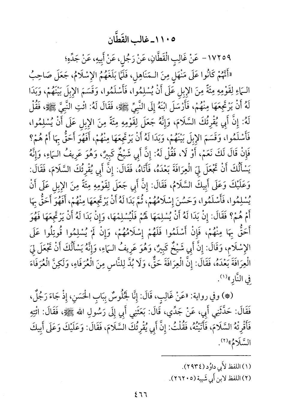 - وفي رواية: «عن غالب العبدي، عن رجل من بني نمير، عن أبيه، عن جَدِّه، أو جد أبيه، قال: قلت: يا رسول الله، إن أبي يقرئك السلام، قال: عليك وعلى أبيك السلام، قلت: يا رسول الله، إن قومي يريدون أن يعرفوني، قال: لا بد من عَرِيف، والعَرِيف في النار» (¬٣).