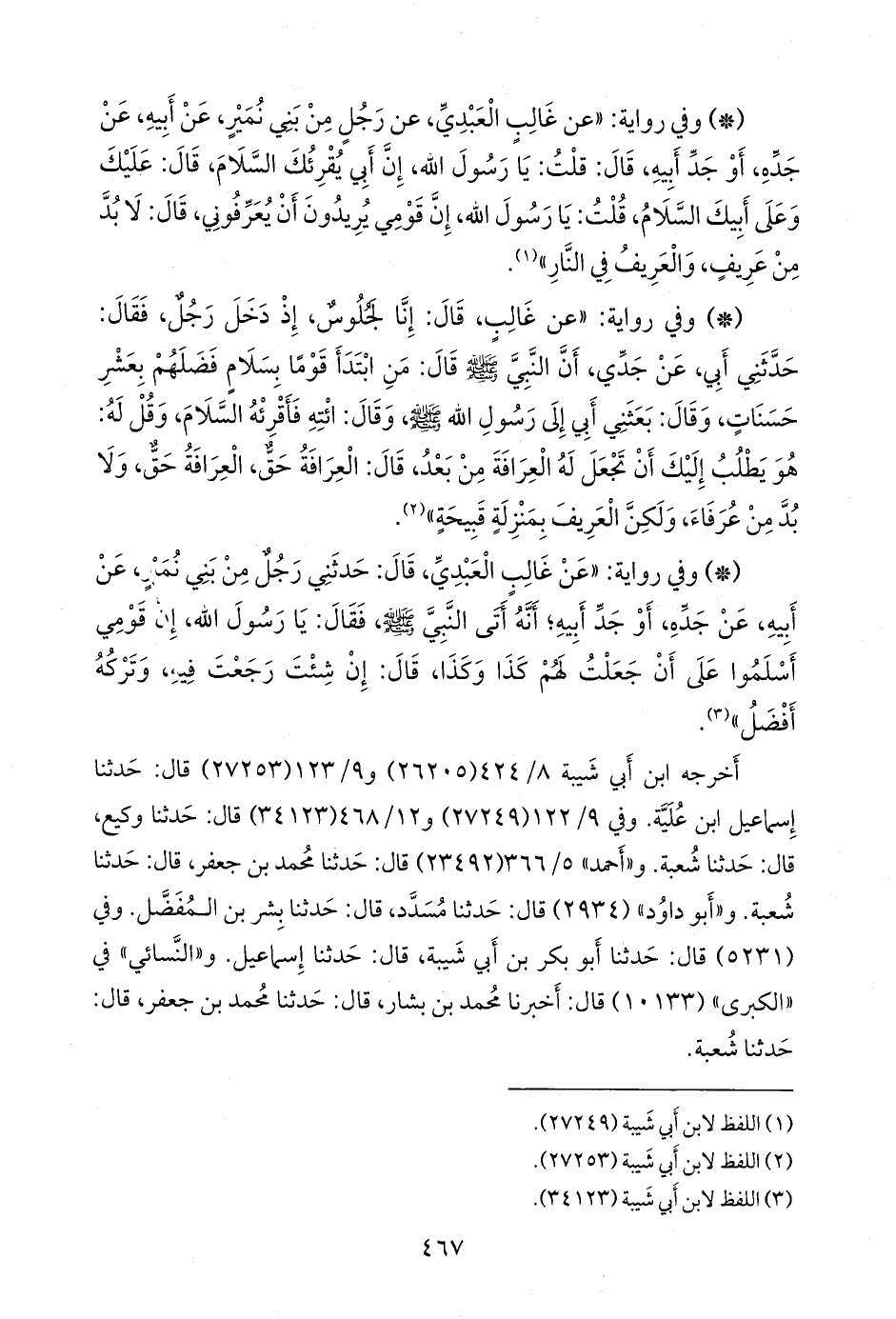 - وفي رواية: «عن غالب، قال: إنا لجلوس، إذ دخل رجل، فقال: حدثني أبي، عن جدي، أن النبي صَلى الله عَليه وسَلم قال: من ابتدأ قوما بسلام فضلهم بعشر حسنات، وقال: بعثني أبي إلى رسول الله صَلى الله عَليه وسَلم وقال: ائته فأقرئه السلام، وقل له: هو يطلب إليك أن تجعل له العرافة من بعد، قال: العرافة حق، العرافة حق، ولا بد من عرفاء، ولكن العَرِيف بمنزلة قبيحة» (¬١).