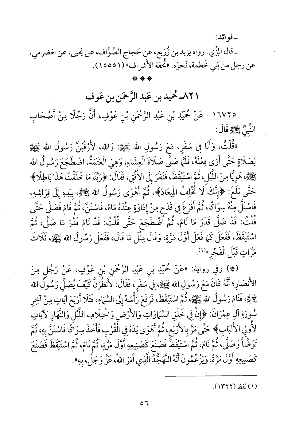 - وفي رواية: «عن حميد بن عبد الرَّحمَن بن عوف، عن رجل من الأنصار؛ أنه كان مع رسول الله صَلى الله عَليه وسَلم في سفر، فقال: لأنظرن كيف يصلي رسول الله صَلى الله عَليه وسَلم فنام رسول الله صَلى الله عَليه وسَلم ثم استيقظ، فرفع رأسه إلى السماء، فتلا أربع آيات من آخر سورة آل عمران: {إن في خلق السماوات والأرض واختلاف الليل والنهار لآيات لأولي الألباب} حتى مر بالأربع، ثم أهوى يده في القرب فأخذ سواكا فاستن به، ثم توضأ وصلى، ثم نام، ثم استيقظ فصنع كصنيعه أول مرة، ثم نام، ثم استيقظ فصنع كصنيعه أول مرة، ويزعمون أنه التهجد الذي أمر الله، عز وجل، به».