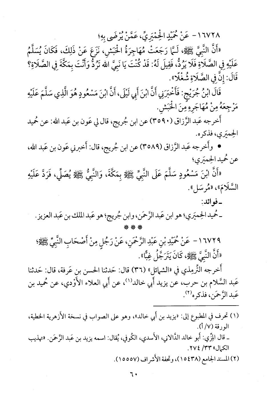 «أن ابن مسعود سلم على النبي صَلى الله عَليه وسَلم بمكة، والنبي صَلى الله عَليه وسَلم يصلي، فرد عليه السلام»، «مُرسَل».