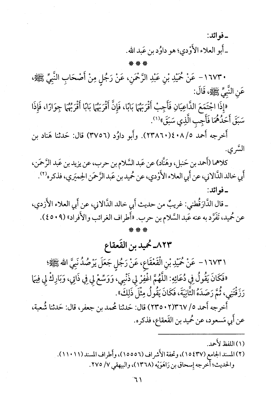 كلاهما (أحمد بن حنبل، وهناد) عن عبد السلام بن حرب، عن يزيد بن عبد الرَّحمَن أبي خالد الدالاني، عن أبي العلاء الأَوْدي، عن حميد بن عبد الرَّحمَن الحميري، فذكره (¬٢).