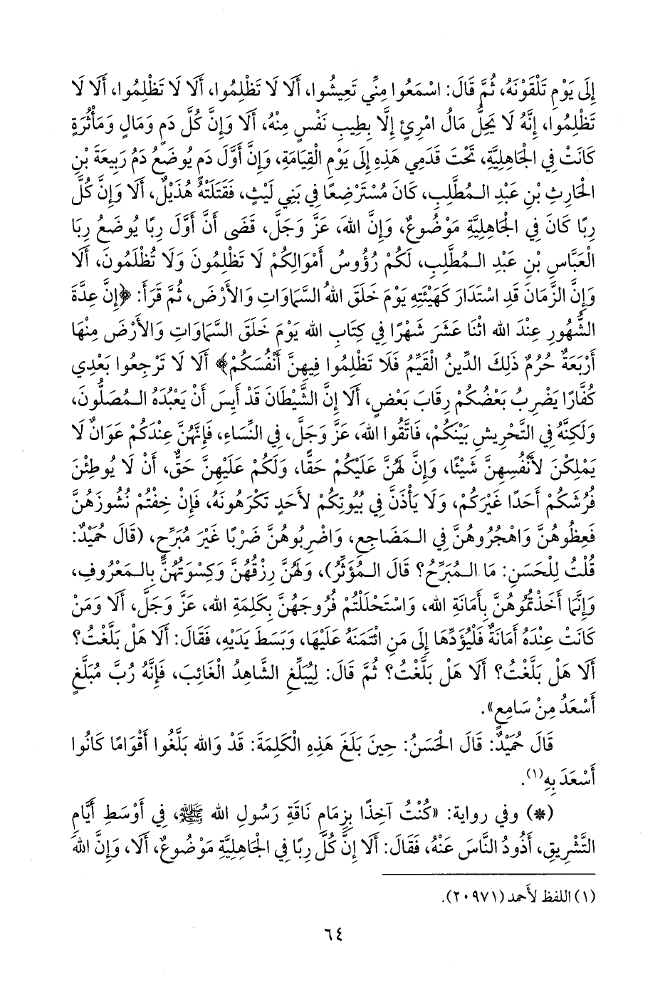 ثم قرأ: {إن عدة الشهور عند الله اثنا عشر شهرا في كتاب الله يوم خلق السماوات والأرض منها أربعة حرم ذلك الدين القيم فلا تظلموا فيهن أنفسكم} ألا لا ترجعوا بعدي كفارا يضرب بعضكم رقاب بعض، ألا إن الشيطان قد أيس أن يعبده المصلون، ولكنه في التحريش بينكم، فاتقوا الله، عز وجل، في النساء، فإنهن عندكم عوان لا يملكن لأنفسهن شيئا، وإن لهن عليكم حقا، ولكم عليهن حق، أن لا يوطئن فرشكم أحدا غيركم، ولا ياذن في بيوتكم لأحد تكرهونه، فإن خفتم نشوزهن فعظوهن واهجروهن في المضاجع، واضربوهن ضربا غير مبرح، (قال حميد: قلت للحسن: ما المبرح؟ قال المؤثر)، ولهن رزقهن وكسوتهن بالمعروف، وإنما أخذتموهن بأمانة الله، واستحللتم فروجهن بكلمة الله، عز وجل، ألا ومن كانت عنده أمانة فليؤدها إلى من ائتمنه عليها، وبسط يديه، فقال: ألا هل بلغت؟ ألا هل بلغت؟ ألا هل بلغت؟ ثم قال: ليبلغ الشاهد الغائب، فإنه رب مبلغ أسعد من سامع».