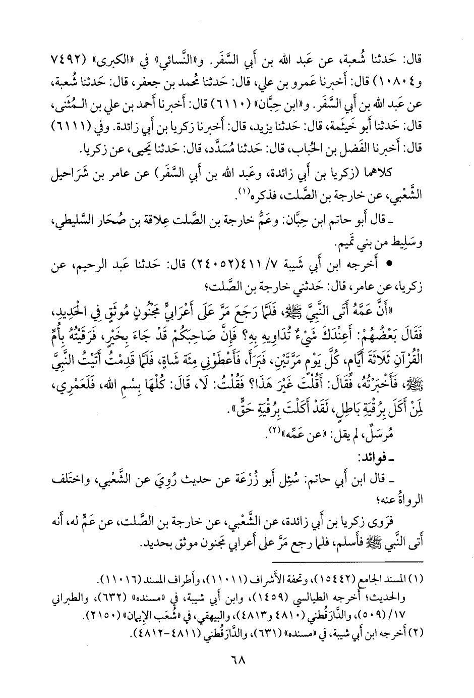 كلاهما (زكريا بن أبي زائدة، وعبد الله بن أبي السفر) عن عامر بن شراحيل الشعبي، عن خارجة بن الصلت، فذكره (¬١).