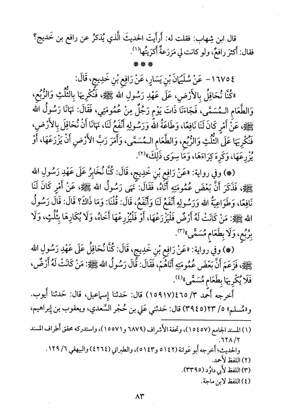 - وفي رواية: «عن رافع بن خَدِيج، قال: كنا نحاقل على عهد رسول الله صَلى الله عَليه وسَلم فزعم أن بعض عمومته أتاهم، فقال: قال رسول الله صَلى الله عَليه وسَلم: من كانت له أرض، فلا يكريها بطعام مسمى» (¬٣).