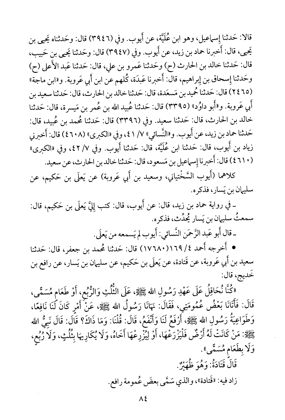 • أَخرجه أحمد (١٧٦٨٠) قال: حدثنا محمد بن جعفر، قال: حدثنا سعيد بن أبي عَروبَة، عن قتادة، عن يَعلى بن حكيم, عن سليمان بن يسار, عن رافع بن خَدِيج, قال: