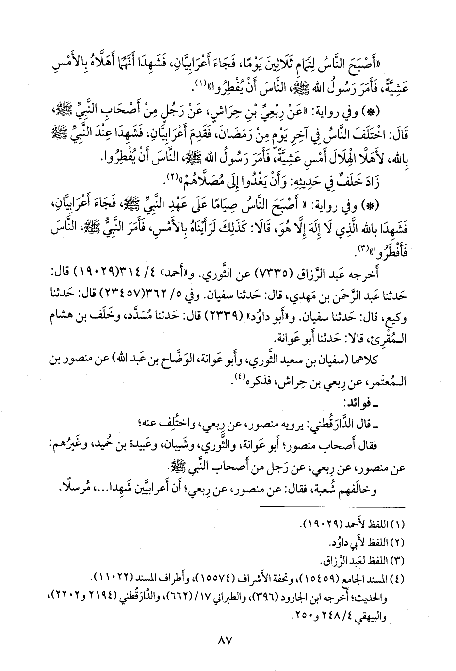 وخالفهم شعبة، فقال: عن منصور، عن ربعي؛ أن أعرابيين شهدا ... ، مُرسلًا.