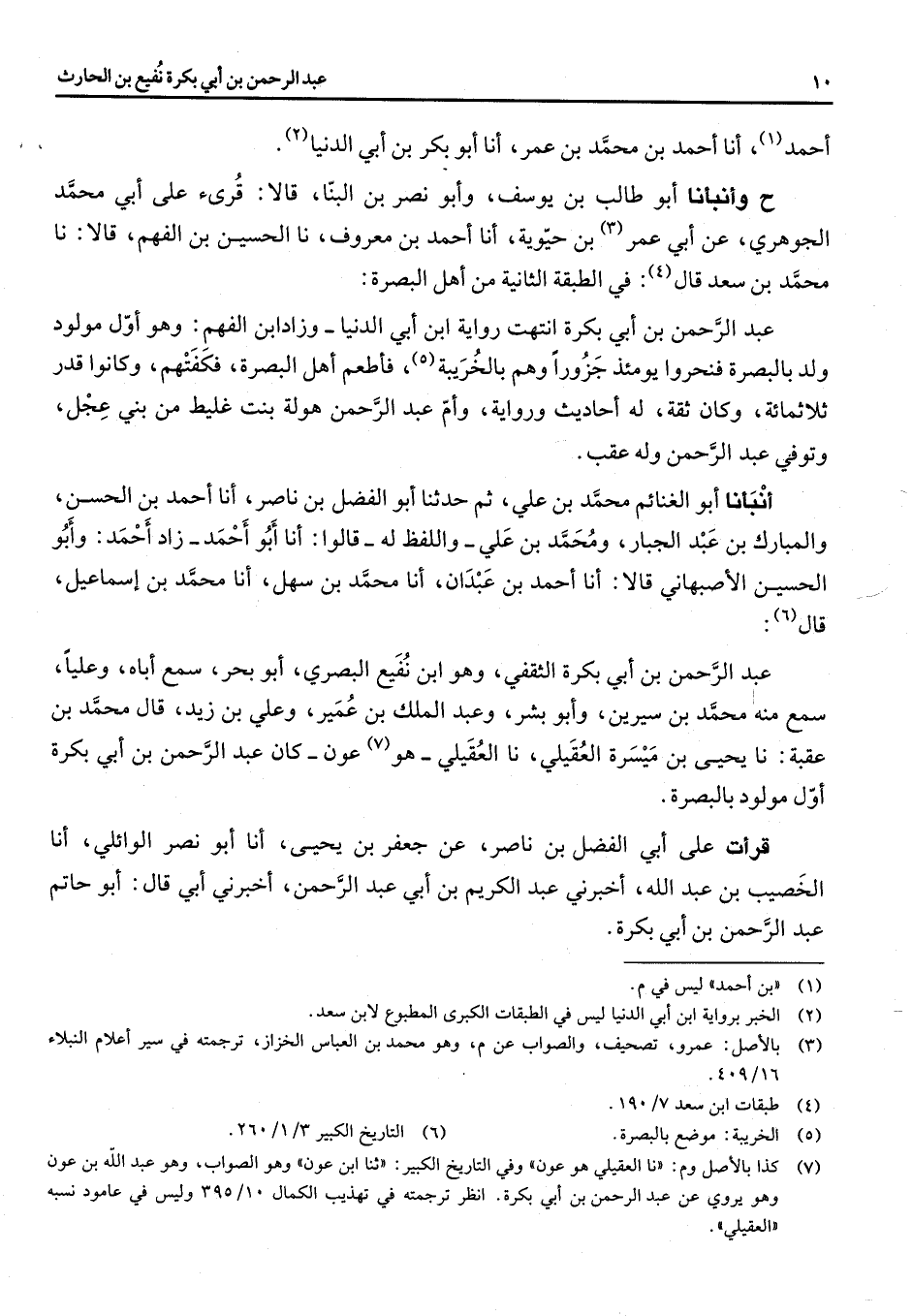 أحمد (1) أنا أحمد بن محمد بن عمر أنا أبو بكر بن أبي الدنيا (2) ح وأنبأنا أبو طالب بن يوسف وأبو نصر بن البنا قالا قرئ على أبي محمد الجوهري عن أبي عمر (3) بن حيوية أنا أحمد بن معروف نا الحسين بن الفهم قالا نا محمد بن سعد قال (4) في الطبقة الثانية من أهل البصرة: عبد الرحمن بن أبي بكرة أنتهت رواية ابن أبي الدنيا وزاد ابن الفهم وهو أول مولود ولد بالبصرة فنحروا يومئذ جزورا وهم بالخريبة (5) فأطعم أهل البصرة فكفتهم وكانوا قدر ثلاثمائة وكان ثقة له أحاديث ورواية وأم عبد الرحمن هولة بنت غليط من بني عجل وتوفي عبد الرحمن وله عقب أنبأنا أبو الغنائم محمد بن علي ثم حدثنا أبو الفضل بن ناصر أنا أحمد بن الحسن والمبارك بن عبد الجبار ومحمد بن علي واللفظ له قالوا أنا أبو أحمد زاد أحمد وأبو الحسين الأصبهاني قالا أنا أحمد بن عبدان أنا محمد بن سهل أنا محمد بن إسماعيل قال (6) عبد الرحمن بن أبي بكرة الثقفي وهو ابن نفيع البصري أبو بحر سمع أباه وعليا سمع منه محمد بن سيرين وأبو بشر وعبد الملك بن عمير وعلي بن زيد قال محمد بن عقبه نا يحيى بن ميسرة العقيلي نا العقيلي هو (7) عون كان عبد الرحمن بن أبي بكرة أول مولود بالبصرة قرأت على أبي الفضل بن ناصر عن جعفر بن يحيى أنا أبو نصر الوائلي أنا الخصيب بن عبد الله أخبرني عبد الكريم بن أبي عبد الرحمن أخبرني أبي قال أبو حاتم عبد الرحمن بن أبي بكرة