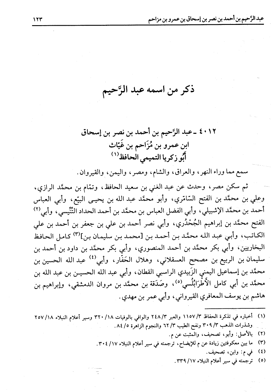 4012 - عبد الرحيم بن أحمد بن نصر بن إسحاق ابن عمرو بن مزاحم بن غياث أبو زكريا التميمي الحافظ (1) سمع مما وراء النهر والعراق والشام ومصر واليمن والقيروان ثم سكن مصر وحدث عن عبد الغني بن سعيد الحافظ وتمام بن محمد الرازي وعلي بن محمد بن الفتح السامري وأبو محمد عبد الله بن يحيى البيع وأبي العباس احمد بن محمد الإشبيلي وأبي الفضل العباس بن محمد بن أحمد الحداد التنيسي وأبي (2) الفتح محمد بن إبراهيم الجحدري وأبي نصر أحمد بن علي بن جعفر بن أحمد بن علي الكاتب وأبي عبد الله محمد بن أحمد بن محمد بن سليمان بن (3) كامل الحافظ البخاريين وأبي بكر محمد بن أحمد المنصوري وأبي بكر محمد بن داود بن أحمد بن سليمان بن الربيع بن مصحح العسقلاني وهلال الحفار وأبي (4) عبد الله الحسين بن محمد بن إسماعيل اليمني الزبيدي الراسبي القطان وأبي عبد الله الحسين بن عبد الله بن محمد بن أبي كامل الأطرابلسي (5) وصدقة بن محمد بن مروان الدمشقي وإبراهيم بن هاشم بن يوسف المعافري القيرواني وأبي عمر بن مهدي