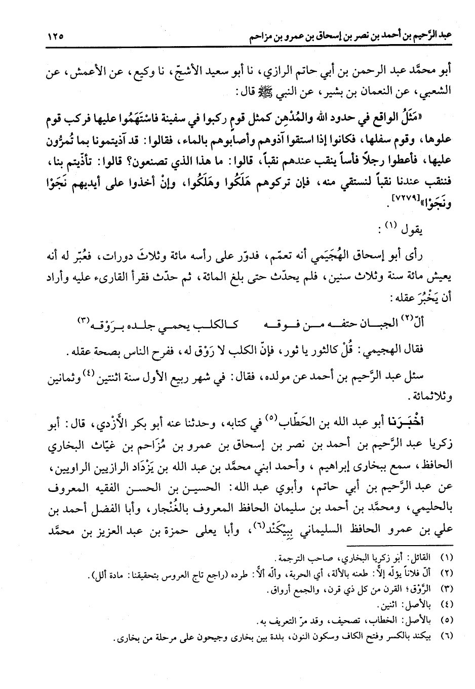 [7279] يقول (1) رأى أبو إسحاق الهجيمي أنه تعمم فدور على رأسه مائة وثلاث دورات فعبر له أنه يعيش مائة سنة وثلاث سنين فلم يحدث حتى بلغ المائة ثم حدث فقرأ القارئ عليه وأراد أن يخبر عقله أل (2) الجبان حتفه من فوقه * كالكلب يحمي جلده بروقه (3) فقال الهجيمي قل كالثور يا ثور فإن الكلب لا روق له ففرح الناس بصحة عقله سئل عبد الرحيم بن أحمد عن مولده فقال في شهر ربيع الأول سنة اثنتين (4) وثمانين وثلاثمائة أخبرنا أبو عبد الله بن الحطاب (5) في كتابه وحدثنا عنه أبو بكر الأزدي قال أبو زكريا عبد الرحيم بن أحمد بن نصر بن إسحاق بن عمرو بن مزاحم بن غياث البخاري الحافظ سمع ببخارى إبراهيم وأحمد ابني محمد بن عبد الله بن يزداد الرازيين الراويين عن عبد الرحيم بن أبي حاتم وأبوي عبد الله الحسين بن الحسن الفقيه المعروف بالحليمي ومحمد بن أحمد بن سليمان الحافظ المعروف بالغنجار وأبا الفضل أحمد بن علي بن عمرو الحافظ السليماني ببيكند (6) وأبا يعلى حمزة بن عبد العزيز بن محمد