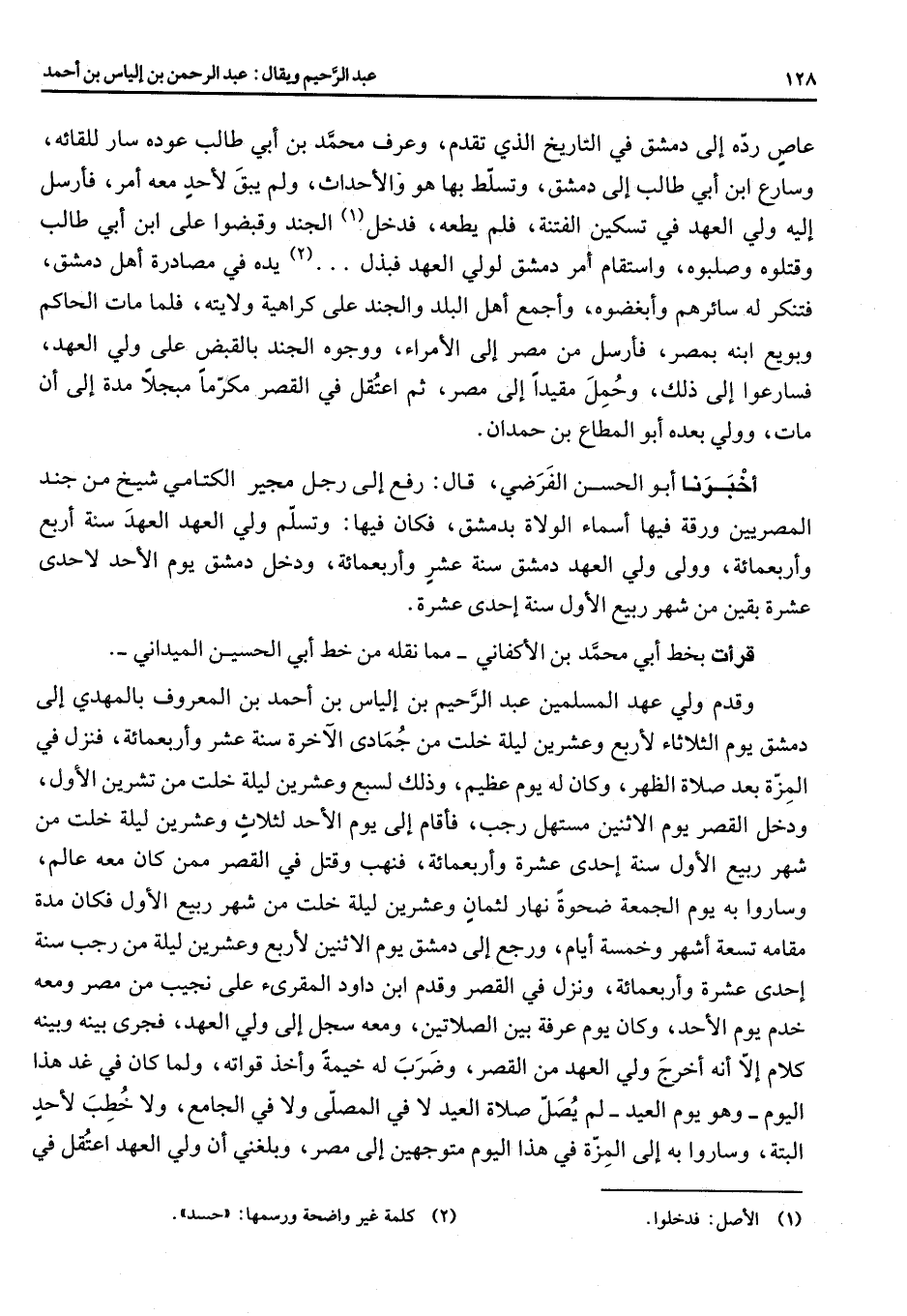 (2) يده في مصادرة أهل دمشق فتنكر له سائرهم وأبغضوه وأجمع أهل البلد والجند على كراهية ولايته فلما مات الحاكم وبويع ابنه بمصر فأرسل من مصر إلى الأمراء ووجوه الجند بالقبض على ولي العهد فسارعوا إلى ذلك وحمل مقيدا إلى مصر ثم اعتقل في القصر مكرما مبجلا مدة إلى أن مات وولي بعده أبو المطاع بن حمدان أخبرنا أبو الحسن الفرضي قال رفع إلى رجل مجير الكتامي شيخ من جند المصريين ورقة فيها أسماء الولاة بدمشق فكان فيها وتسلم ولي العهد العهد سنة أربع وأربعمائة وولى ولي العهد دمشق سنة عشر وأربعمائة ودخل دمشق يوم الأحد لاحدى عشرة بقين من شهر ربيع الأول سنة إحدى عشرة قرأت بخط أبي محمد بن الأكفاني مما نقله من خط أبي الحسين الميداني وقدم ولي عهد المسلمين عبد الرحيم بن إلياس بن أحمد بن المعروف بالمهدي إلى دمشق يوم الثلاثاء لأربع وعشرين ليلة خلت من جمادى الآخرة سنة عشر وأربعمائة فنزل في المزة بعد صلاة الظهر وكان له يوم عظيم وذلك لسبع وعشرين ليلة خلت من تشرين الأول ودخل القصر يوم الاثنين مستهل رجب فأقام إلى يوم الأحد لثلاث وعشرين ليلة خلت من شهر ربيع الول سنة إحدى عشرة وأربعمائة فنهب وقتل في القصر ممن كان معه عالم وساروا به يوم الجمعة ضحوة نهار لثمان وعشرين ليلة خلت من شهر ربيع الأول فكان مدة مقامه تسعة أشهر وخمسة أيام ورجع إلى دمشق يوم الاثنين لأربع وعشرين ليلة من رجب سنة إحدى عشرة وأربعمائة ونزل في القصر وقدم ابن داود المقرئ على نجيب من مصر ومعه خدم يوم الأحد كان يوم عرفة بين الصلاتين ومعه سجل إلى ولي العهد فجرى بينه وبينه كلام إلا أنه أخرج ولي العهد من القصر وضرب له خيمة وأخذ قواته ولما كان في غد هذا اليوم وهو يوم العيد لم يصل صلاة العيد لا في المصلى ولا في الجامع ولا خطب لإحد البتة وساروا به إلى المزة في هذا اليوم متوجهين إلى مصر وبلغني ان ولي العهد اعتقل في