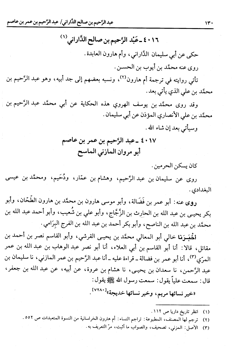 4017 - عبد الرحيم بن عمر بن عاصم أبو مروان المازني الماسح كان يسكن الحرمين روى عن سليمان بن عبد الرحيم وهشام بن عمار ودحيم ومحمد بن عيسى البغدادي روى عنه أبو عمر بن فاضلة وأبو موسى هارون بن محمد بن هارون الطحان وأبو بكر يحيى بن عبد الله بن الحارث بن الزجاج وأبو علي بن شعيب وابو أحمد عبد الله بن محمد بن عبد الله بن الناصح وابو بكر أحمد بن عبد الله بن الفرج البرامي أخبرنا خالي أبو المعالي محمد بن يحيى القرشي وأبو القاسم نصر بن أحمد بن مقاتل قالا انا أبو قاسم بن أبي العلاء انا أبو نصر عبد الوهاب بن عبد الله بن عمر المري (3) انا أبو عمر بن فضالة قراءة عليه أنا عبد الرحيم بن عمر المازني نا سليمان بن عبد الرحمن نا سعدان بن يحيى نا هشام بن عروة عن أبيه عن عبد الله بن جعفر قال سمعت عليا يقول سمعت رسول الله (صلى الله عليه وسلم) يقول (خير نسائها مريم وخير نسائها خديجة)