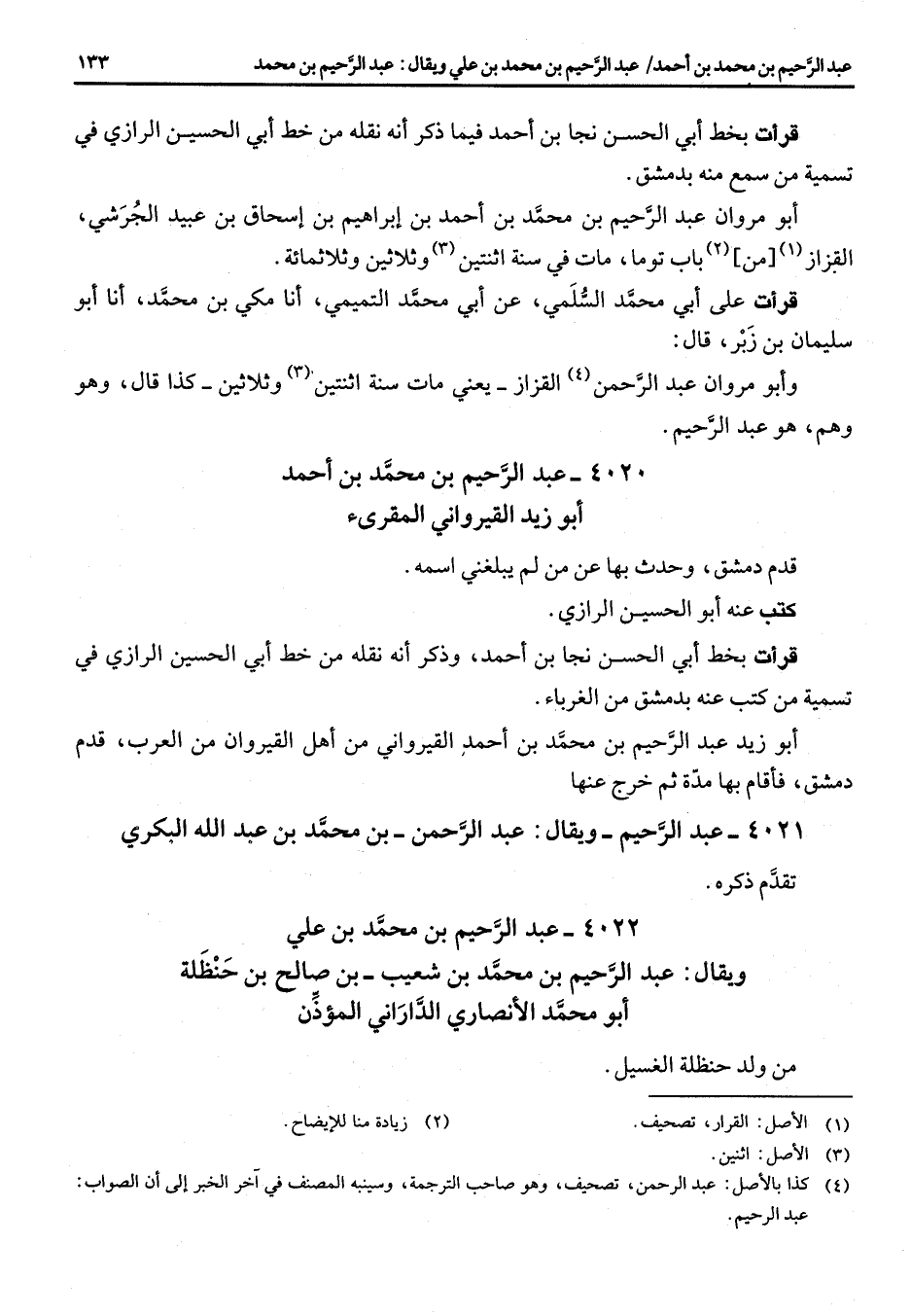 قرأت بخط أبي الحسن نجا بن أحمد فيما ذكر أنه نقله من خط أبي الحسين الرازي في تسمية من سمع منه بدمشق أبو مروان عبد الرحيم بن محمد بن أحمد بن إبراهيم بن إسحاق بن عبيد الجرشي القزاز (1) من (2) باب توما مات في سنة اثنتين (3) وثلاثين وثلاثمائة قرأت على أبي محمد السلمي عن أبي محمد التميمي أنا مكي بن محمد أنا أبو سليمان بن زبر قال وأبو مروان عبد الرحمن (4) القزاز يعني مات سنة اثنتين (3) وثلاثين كذا قال وهو عبد الرحيم 4020 عبد الرحيم بن محمد بن أحمد أبو زيد القيرواني المقرئ قدم دمشق وحدث بها عن من لم يبلغني اسمه كتب عنه أبو الحسين الرازي قرأت بخط أبي الحسن نجا بن أحمد وذكر أنه نقله من خط أبي الحسين الرازي في تسمية من كتب عنه بدمشق من الغرباء أبو زيد عبد الرحيم بن محمد بن أحمد القيرواني من أهل القيروان من العرب قدم دمشق فأقام بها مدة ثم خرج عنها