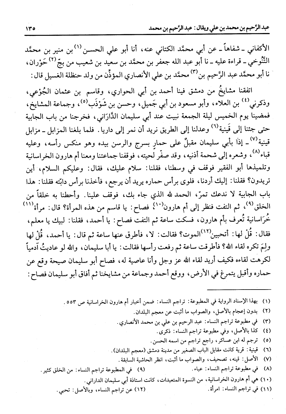 الأكفاني شفاها عن أبي محمد الكتاني عنه أنا أبو علي الحسن (1) بن منير بن محمد التنوخي قراءة عليه نا أبو عبد الله جعفر بن محمد بن سعيد بن شعيب من بج (2) حوران نا أبو محمد عبد الرحيم بن (3) محمد بن علي الأنصاري المؤذن من ولد حنظلة الغسيل قال اتفقنا مشايخ من دمشق فينا أحمد بن أبي الحواري وقاسم بن عثمان الجوعي وذكرني (4) بن العلاء وأبو مسعود بن أبي جميل وحسن بن شوذب (5) وجماعة المشايخ فمضينا يوم الخميس ليلة الجمعة نبيت عند أبي سليمان الداراني فخرجنا من باب الجابية حتى جئنا إلى قينية (6) وعدلنا إلى الطريق نريد أن نمر إلى داريا فلما بلغنا المزابل مزابل قينية (7) إذا بأبي سليمان مقبل على حمار بسرج والرسن بيده وهو منكس رأسه وعليه قباء (8) وشعره إلى شحمة أذنيه وقد صفر لحيته فوقفنا جماعتنا ومعنا أم هارون الخراسانية وتلميذها أبو الفقير فوقف في وسطنا فقلنا سلام عليك فقال وعليكم السلام أين تريدون فقلنا إليك أردنا فلوى برأس حماره يريد أن يرجع فأخذنا برأس دابته فقلنا هذا باب الجابية لا ندعك تمر الحمد لله الذي جاء بك فوقف علينا وأحطنا به خلقا من الخلق (9) ثم التفت فنظر إلى أم هارون (10) فصاح يا قاسم من هذه المرأة قال امرأة (11) خراسانية تعرف بأم هارون فسكت ساعة ثم التفت فصاح يا أحمد فقلنا لبيك يا معلم فقال قل لها اتحبين (12) الموت؟ فقالت لا فأطرق عنها ساعة ثم قال يا أحمد قل لها ولم تكره لقاء الله فأطرقت ساعة ثم رفعت رأسها فقالت يا أبا سليمان والله لو عاديت آدميا لكرهت لقاءه فكيف أريد لقاء الله عز وجل وأنا عاصية له فصاح أبو سليمان صيحة وقع عن حماره وأقبل يتمرغ في الأرض ووقع أحمد وجماعة من مشايخنا ثم أفاق أبو سليمان فصاح