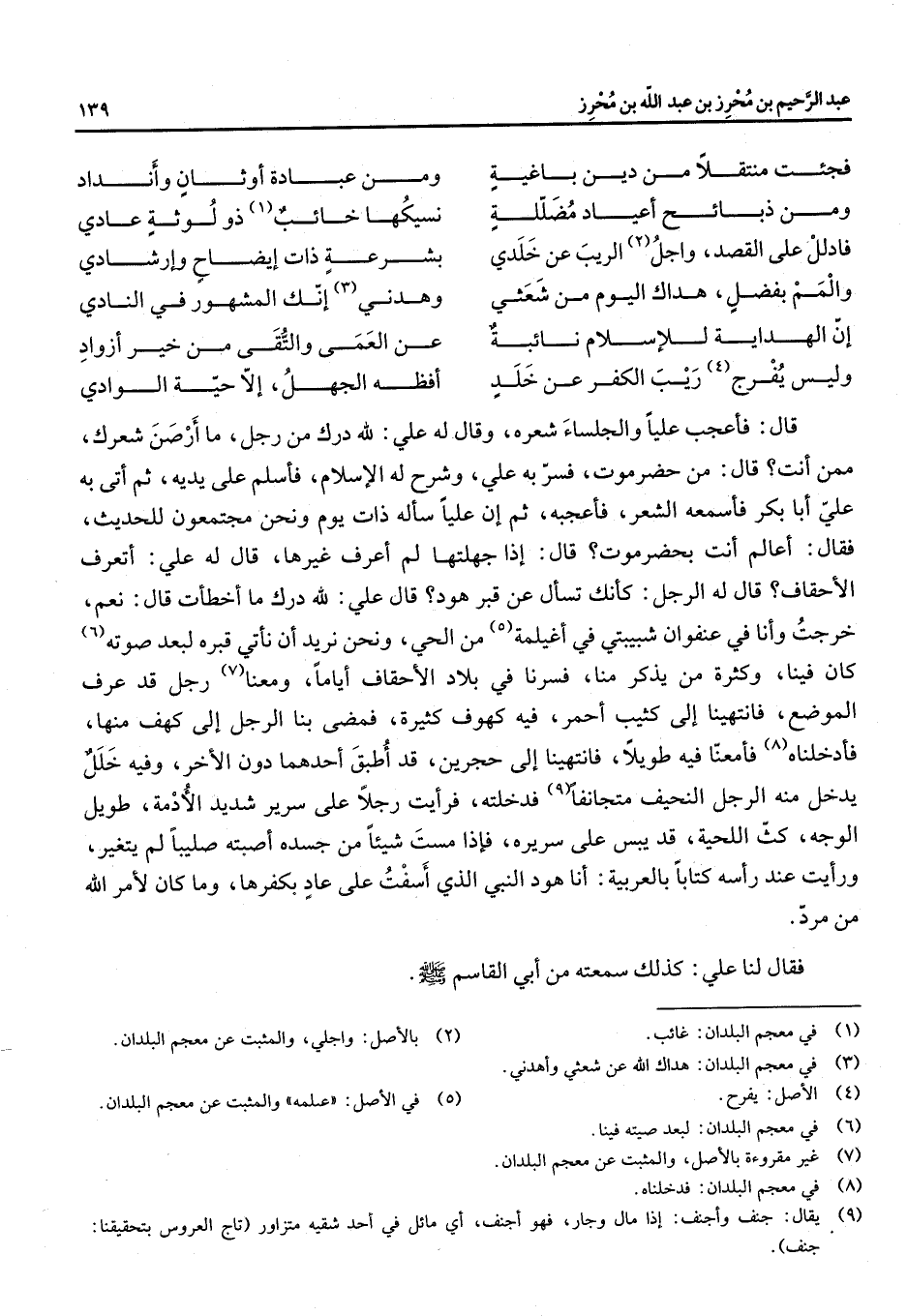 فجئت منتقلا من دين باغية * ومن عبادة أوثان وأنداد ومن ذبائح أعياد مضللة * نسيكها خائب (1) ذو لوثة عادي فادلل على القصد واجل (2) الريب عن خلدي * بشرعة ذات إيضاح وإرشادي والمم بفضل هداك اليوم من شعثي * وهدني (3) إنك المشهور في النادي إن الهداية للإسلام نائبة * عن العمى والتقى من خير أزواد وليس يفرج (4) ريب الكفر عن خلد * أفظه الجهل إلا حية الوادي قال فأعجب عليا والجلساء شعره وقال له علي لله درك من رجل ما أرصن شعرك ممن أنت قال من حضرموت فسر به علي وشرح له الإسلام فأسلم على يديه ثم أتى به علي أبا بكر فأسمعه الشعر فأعجبه ثم إن عليا سأله ذات يوم ونحن مجتمعون للحديث فقال أعالم أنت بحضرموت قال إذا جهلتها لم أعرف غيرها قال له علي أتعرف الأحقاف قال له الرجل كأنك تسأل عن قبر هود قال علي لله درك ما أخطأت قال نعم خرجت وأنا في عنفوان شبيبتي في أغيلمة (5) من الحي ونحن نريد أن نأتي قبره لبعد صوته (6) كان فينا وكثرة من يذكر منا فسرنا في بلاد الأحقاف أياما ومعنا (7) رجل قد عرف الموضع فانتهينا إلى كثيب أحمر فيه كهوف كثيرة فمضى بنا الرجل إلى كهف منها فأدخلناه (8) فأمعنا فيه طويلا فانتهينا إلى حجرين قد أطبق أحدهما دون الآخر وفيه خلل يدخل منه الرجل النحيف متجانفا (9) فدخلته فرأيت رجلا على سرير شديد الأدمة طويل الوجه كث اللحية قد يبس على سريره فإذا مست شيئا من جسده أصبته صليبا لم يتغير ورأيت عند رأسه كتابا بالعربية أنا هود النبي الذي أسفت على عاد بكفرها وما كان لأمر الله من مرد فقال لنا علي كذلك سمعته من أبي القاسم (صلى الله عليه وسلم)