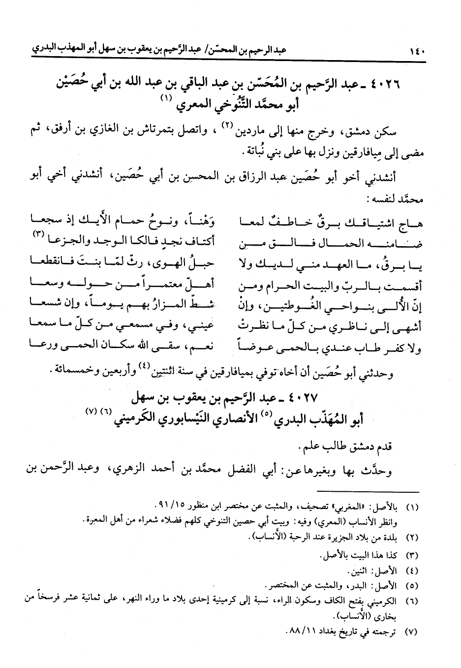 4027 - عبد الرحيم بن يعقوب بن سهل أبو المهذب البدري (5) الأنصاري النيسابوري الكرميني (6) (7) قدم دمشق طالب علم وحدث بها وبغيرها عن أبي الفضل محمد بن أحمد الزهري وعبد الرحمن بن