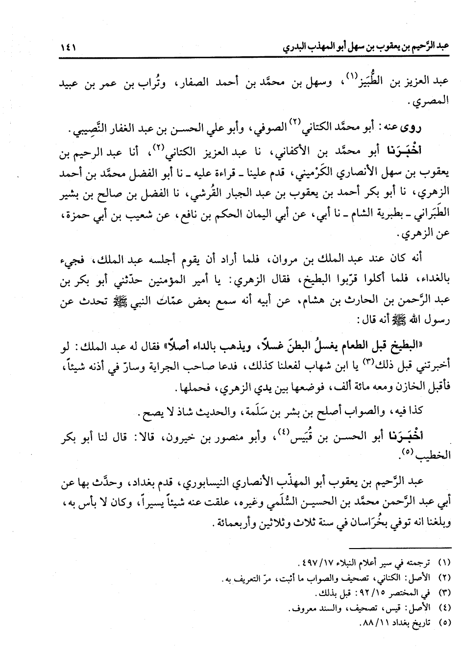 عبد العزيز بن الطبيز (1) وسهل بن محمد بن أحمد الصفار وتراب بن عمر بن عبيد المصري روى عنه أبو محمد الكتاني (2) الصوفي وأبو علي الحسن بن عبد الغفار النصيبي أخبرنا أبو محمد بن الأكفاني نا عبد العزيز الكتاني (2) أنا عبد الرحيم بن يعقوب بن سهل الأنصاري الكرميني قدم علينا قراءة عليه نا أبو الفضل محمد بن أحمد الزهري نا أبو بكر أحمد بن يعقوب بن عبد الجبار القرشي نا الفضل بن صالح بن بشير الطبراني بطبرية الشام نا أبي عن أبي اليمان الحكم بن نافع عن شعيب بن أبي حمزة عن الزهري أنه كان عند عبد الملك بن مروان فلما أراد أن يقوم أجلسه عبد الملك فجئ بالغداء فلما أكلوا قربوا البطيخ فقال الزهري يا أمير المؤمنين حدثني أبو بكر بن عبد الرحمن بن الحارث بن هشام عن أبيه أنه سمع بعض عمات النبي (صلى الله عليه وسلم) تحدث عن رسول الله (صلى الله عليه وسلم) أنه قال (البطيخ قبل الطعام يغسل البطن غسلا ويذهب بالداء أصلا) فقال له عبد الملك لو أخبرتني قبل ذلك (3) يا ابن شهاب لفعلنا كذلك فدعا صاحب الجراية وسار في أذنه شيئا فأقبل الخازن ومعه مائة ألف فوضعها بين يدي الزهري فحملها كذا فيه والصواب أصلح بن بشر بن سلمة والحديث شاذ لا يصح أخبرنا أبو الحسن بن قبيس (4) وأبو منصور بن خيرون قالا قال لنا أبو بكر الخطيب (5) عبد الرحيم بن يعقوب أبو المهذب الأنصاري النيسابوري قدم بغداد وحدث بها عن أبي عبد الرحمن محمد بن الحسين السلمي وغيره علقت عنه شيئا يسيرا وكان لا بأس به وبلغنا أنه توفي بخراسان في سنة ثلاث وثلاثين وأربعمائة