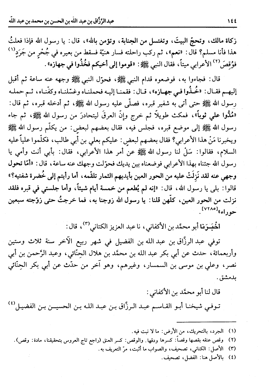 [7285] أخبرنا أبو محمد بن الأكفاني نا عبد العزيز الكتاني (3) قال توفي عبد الرزاق بن عبد الله بن الفضيل في شهر ربيع الآخر سنة ثلاث وستين وأربعمائة حدث عن أبي بكر عبد الله بن محمد بن هلال الحنائي وعبد الرحمن بن أبي نصر وعلي بن موسى بن السمسار وغيرهم وهو آخر من حدث عن أبي بكر الحنائي بدمشق قال لنا أبو محمد بن الأكفاني توفي شيخنا أبو القاسم عبد الرزاق بن عبد الله بن الحسين بن الفضيل (4)