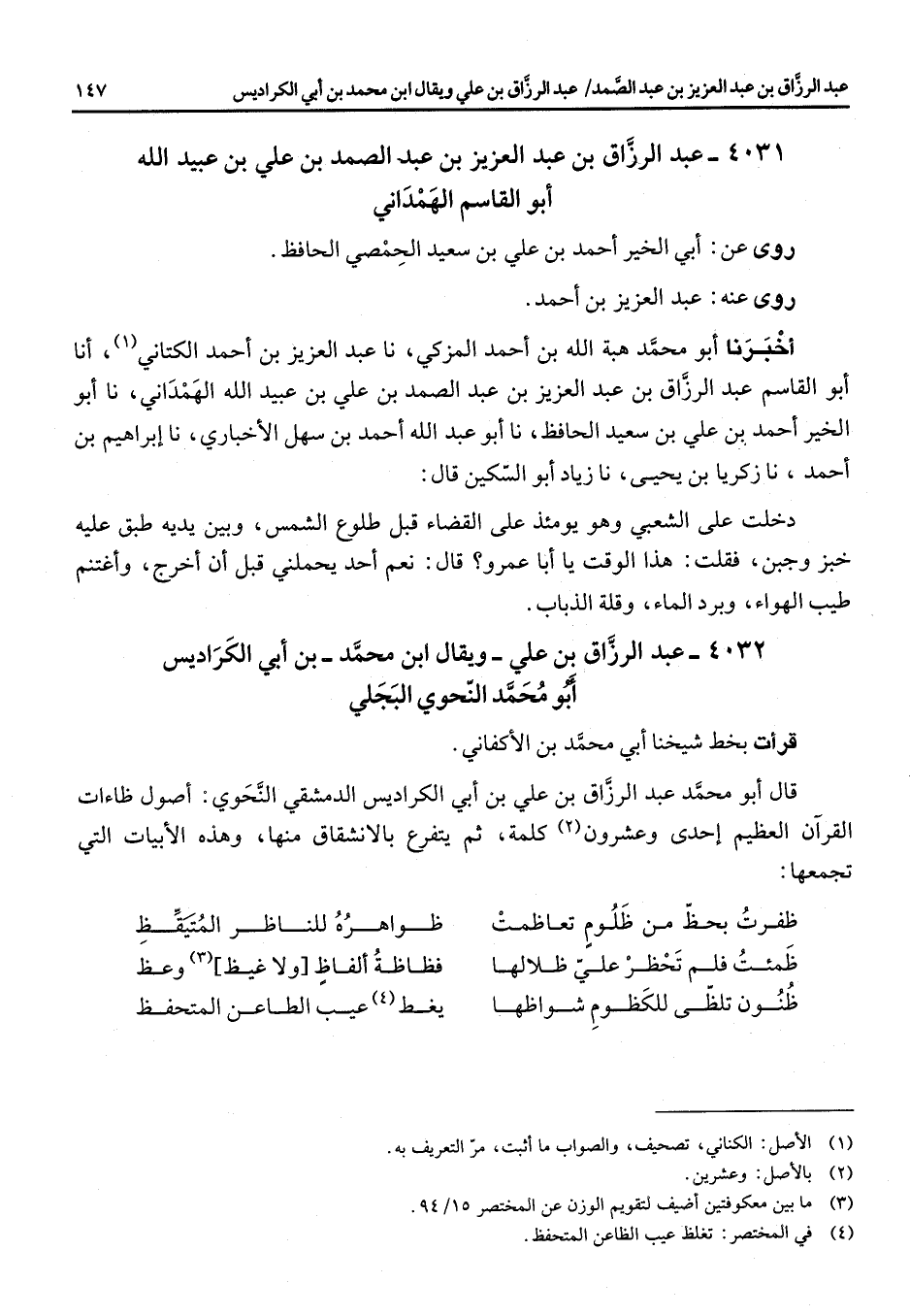 4032 - عبد الرزاق بن علي ويقال ابن محمد بن أبي الكراديس أبو محمد النحوي البجلي قرأت بخط شيخنا أبي محمد بن الأكفاني قال أبو محمد عبد الرزاق بن علي بن أبي الكراديس الدمشقي النحوي أصول ظاءات القرآن العظيم إحدى وعشرون (2) كلمة ثم يتفرع بالانشقاق منها وهذه الأبيات التي تجمعها ظفرت بحظ من ظلوم تعاظمت * ظواهره للناظر المتيقظ ظمئت فلم تحظر علي ظلالها * فظاظة ألفاظ ولا غيظ (3) وعظ ظنون تلظى للكظوم شواظها * يغط (4) عيب الطاعن المتحفظ