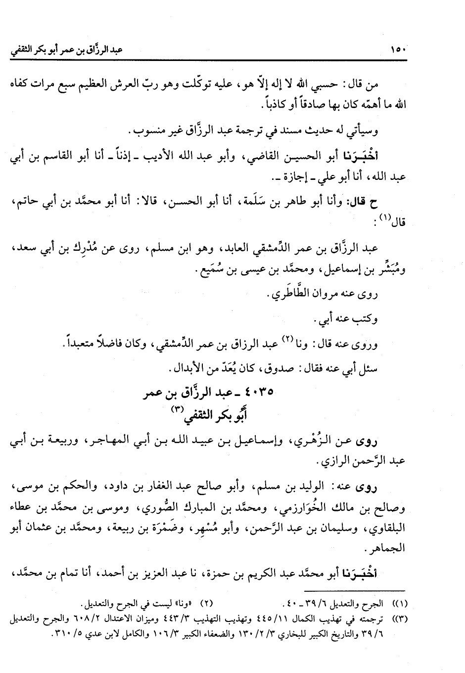 من قال حسبي الله لا اله الا هو عليه توكلت وهو رب العرش العظيم سبع مرات كفاه الله ما أهمه كان به صادقا أو كاذبا وسيأتي له حديث مسند في ترجمة عبد الرزاق غير منسوب أخبرنا أبو الحسين القاضي وأبو عبد الله الأديب اذنا أنا أبو القاسم بن أبي عبد الله أنا أبو علي - اجازة - ح قال وأنا أبو طاهر بن سلمة أنا أبو الحسن قالا أنا أبو محمد بن أبي حاتم قال (1) عبد الرزاق بن عمر الدمشقي العابد وهو ابن مسلم روى عن مدرك بن أبي سعد ومبشر بن اسماعيل ومحمد بن عيسى بن سميع روى عنه مروان الطاطري وكتب عنه أبي وروى عنه قال ونا (2) عبد الرزاق بن عمر الدمشقي وكان فاضلا متعبدا سئل أبي عنه فقال صدوق كان يعد من الابدال