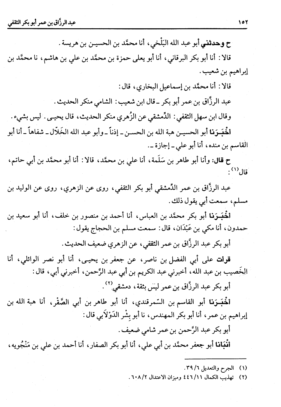ح وحدثني أبو عبد الله البلخي أنا محمد بن الحسين بن هريسة قالا أنا أبو بكر البرقاني أنا أبو يعلى حمزة بن محمد بن علي بن هاشم نا محمد بن إبراهيم بن شعيب قالا أنا محمد بن إسماعيل البخاري قال عبد الرزاق بن عمر أبو بكر قال ابن شعيب الشامي منكر الحديث وقال ابن سهل الثقفي الدمشقي عن الزهري منكر الحديث قال يحيى ليس بشئ أخبرنا أبو الحسين هبة الله بن الحسن إذنا وأبو عبد الله الخلال شفاها أنا أبو القاسم بن منده أنا أبو علي - إجازة - ح قال وأنا أبو طاهر بن سلمة أنا علي بن محمد قالا أنا أبو محمد بن أبي حاتم قال (1) عبد الرزاق بن عمر الدمشقي أبو بكر الثقفي روى عن الزهري روى عن الوليد بن مسلم سمعت أبي يقول ذلك أخبرنا أبو بكر محمد بن العباس أنا أحمد بن منصور بن خلف أنا أبو سعيد بن حمدون أنا مكي بن عبدان قال سمعت مسلم بن الحجاج يقول أبو بكر عبد الرزاق بن عمر الثقفي عن الزهري ضعيف الحديث قرأت على أبي الفضل بن ناصر عن جعفر بن يحيى أنا أبو نصر الوائلي انا الخصيب بن عبد الله أخبرني عبد الكريم بن أبي عبد الرحمن أخبرني أبي قال أبو بكر عبد الرزاق بن عمر ليس بثقة دمشقي (2) أخبرنا أبو القاسم بن السمرقندي أنا أبو طاهر بن أبي الصقر أنا هبة الله بن إبراهيم بن عمر أنا أبو بكر المهندس نا أبو بشر الدولابي قال أبو بكر عبد الرحمن بن عمر شامي ضعيف أنبأنا أبو جعفر محمد بن أبي علي أنا أبو بكر الصفار أنا أحمد بن علي بن منجويه