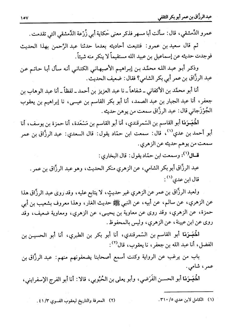 عمرو الدمشقي قال سألت أبا مسهر فذكر معنى حكاية أبي زرعة الدمشقي التي تقدمت ثم قال سعيد بن عمرو فتتبعت أحاديثه بعدما حدثنا عبد الرحمن بهذا الحديث فوجدت حديثه عن إسماعيل بن عبيد الله مستقيما لا ينكر منه شيئا وذكر أبو عبد الله محمد بن إبراهيم الأصبهاني الكتاني أنه سأل ابا حاتم عن عبد الرزاق بن عمر أبي بكر الشامي فقال ضعيف الحديث أنا أبو محمد بن الأكفاني شفاها نا عبد العزيز بن أحمد لفظا أنا عبد الوهاب بن جعفر أنا عبد الجبار بن عبد الصمد أنا أبو بكر القاسم بن عيسى نا إبراهيم بن يعقوب الجوزجاني قال عبد الرزاق سمعت من يوهن حديثه أخبرنا أبو القاسم بن السمرقندي أنا أبو القاسم بن مسعدة أنا حمزة بن يوسف أنا أبو أحمد بن عدي (1) قال سمعت ابن حماد يقول قال السعدي عبد الرزاق بن عمر سمعت من يوهم حديثه عن الزهري قال (1) وسمعت ابن حماد يقول قال البخاري عبد الرزاق أبو بكر الشامي عن الزهري منكر الحديث وهو عبد الرزاق بن عمر قال ابن عدي (1) ولعبد الرزاق بن عمر عن الزهري غير حديث لا يتابع عليه وقد روى عبد الرزاق هذا عن الزهري عن سالم عن أبيه عن النبي (صلى الله عليه وسلم) حديث الغار وهذا معروف بشعيب بن أبي حمزة عن الزهري وقد روى عن معاوية بن يحيى عن الزهري ومعاوية ضعيف وقد روى عن ابن عيينة عن الزهري وليس بالمحفوظ أخبرنا أبو القاسم بن السمرقندي أنا أبو بكر بن الطبري أنا أبو الحسين بن الفضل انا عبد الله بن جعفر نا يعقوب قال (2) باب من يرغب عن الرواية وكنت أسمع اصحابنا يضعفونهم منهم عبد الرزاق بن عمر شامي أخبرنا أبو الحسن الفرضي وأبو يعلى بن الحبوبي قالا أنا أبو الفرج الإسفرايني