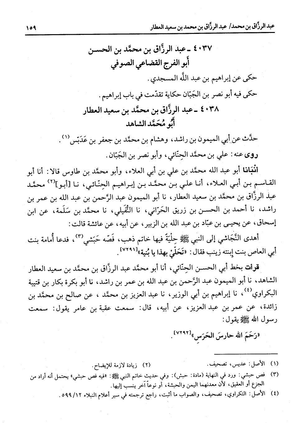4037 - عبد الرزاق بن محمد بن الحسن أبو الفرج القضاعي الصوفي حكى عن إبرهيم بن عبد الله المسجدي حكى فيه أبو نصر بن الجبان حكاية تقدمت في باب إبراهيم