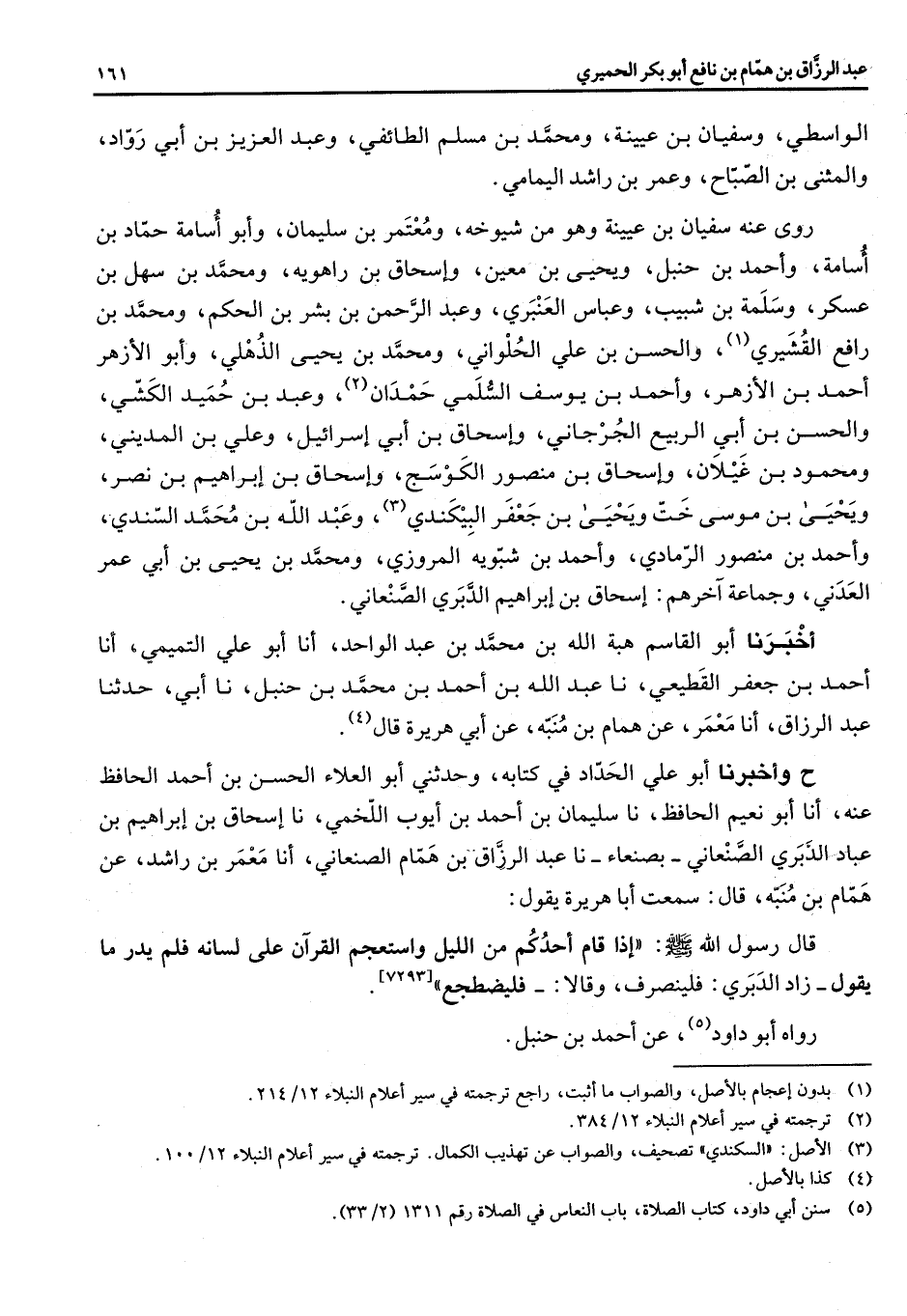 الواسطي وسفيان بن عيينة ومحمد بن مسلم الطائفي وعبد العزيز بن أبي رواد والمثنى بن الصباح وعمر بن راشد اليمامي روى عنه سفيان بن عيينة وهو من شيوخه ومعتمر بن سليمان وأبو أسامة حماد بن أسامة وأحمد بن حنبل ويحيى بن معين وإسحاق بن راهوية ومحمد بن سهل بن عسكر وسلمة بن شبيب وعباس العنبري وعبد الرحمن بن بشر بن الحكم ومحمد بن رافع القشيري (1) والحسن بن علي الحلواني ومحمد بن يحيى الذهلي وأبو الأزهر أحمد بن الأزهر وأحمد بن يوسف السلمي حمدان (2) وعبد بن حميد الكشي والحسن بن أبي الربيع الجرجاني وإسحاق بن أبي إسرائيل وعلي بن المديني ومحمود بن غيلان وإسحاق بن منصور الكوسج وإسحاق بن إبراهيم بن نصر ويحيى بن موسى خت ويحيى بن جعفر البيكندي (3) وعبد الله بن محمد السندي وأحمد بن منصور الرمادي وأحمد بن شبويه المروزي ومحمد بن يحيى بن أبي عمر العدني وجماعة آخرهم إسحاق بن إبراهيم الدبري الصنعاني أخبرنا أبو القاسم هبة الله بن محمد بن عبد الواحد أنا أبو علي التميمي أنا احمد بن جعفر القطيعي نا عبد الله بن أحمد بن محمد بن حنبل نا أبي حدثنا عبد الرزاق أنا معمر عن همام بن منبه عن ابي هريرة قال (4) ح وأخبرنا أبو علي الحداد في كتابه وحدثني أبو العلاء الحسن بن أحمد الحافظ عنه انا أبو نعيم الحافظ نا سليمان بن احمد بن أيوب اللخمي نا إسحاق بن إبراهيم بن عباد الدبري الصنعاني بصنعاء نا عبد الرزاق بن همام الصنعاني أنا معمر بن راشد عن همام بن منبه قال سمعت أبا هريرة يقول قال رسول الله (صلى الله عليه وسلم) إذا قام أحدكم من الليل واستعجم القرآن على لسانه فلم يدر ما يقول زاد الدبري فلينصرف وقالا فليضطجع