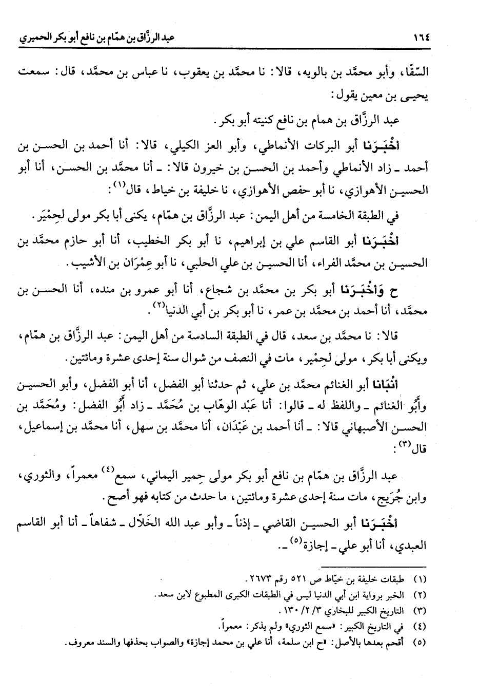 السقا وأبو محمد بن بالويه قالا نا محمد بن يعقوب نا عباس بن محمد قال سمعت يحيى بن معين يقول عبد الرزاق بن همام بن نافع كنيته أبو بكر اخبرنا أبو البركات الأنماطي وأبو العز الكيلي قالا أنا أحمد بن الحسن بن أحمد زاد الأنماطي وأحمد بن الحسن بن خيرون قالا أنا محمد بن الحسن أنا أبو الحسين الأهوازي نا أبو حفص الأهوازي نا خليفة بن خياط قال (1) في الطبقة الخامسة من أهل اليمن عبد الرزاق بن همام يكنى أبا بكر مولى لحمير أخبرنا أبو القاسم علي بن إبراهيم نا أبو بكر الخطيب أنا أبو حازم محمد بن الحسين بن محمد الفراء أنا الحسين بن علي الحلبي نا أبو عمران بن الأشيب ح وأخبرنا أبو بكر بن محمد بن شجاع أنا أبو عمرو بن منده أنا الحسن بن محمد أنا أحمد بن محمد بن عمر نا أبو بكر بن أبي الدنيا (2) قالا نا محمد بن سعد قال في الطبقة السادسة من أهل اليمن عبد الرزاق بن همام ويكنى أبا بكر مولى لحمير مات في النصف من شوال سنة إحدى عشرة ومائتين أنبأنا أبو الغنائم محمد بن علي ثم حدثنا أبو الفضل أنا أبو الفضل وأبو الحسين وأبو الغنائم واللفظ له قالوا أنا عبد الوهاب بن محمد زاد أبو الفضل ومحمد بن الحسن الأصبهاني قالا أنا احمد بن عبدان أنا محمد بن سهل أنا محمد بن إسماعيل قال (3) عبد الرزاق بن همام بن نافع أبو بكر مولى حمير اليماني سمع (4) معمرا والثوري وابن جريج مات سنة إحدى عشرة ومائتين ما حدث من كتابه فهو أصح أخبرنا أبو الحسين القاضي إذنا وأبو عبد الله الخلال شفاها أنا أبو القاسم العبدي أنا أبو علي - إجازة - (5)