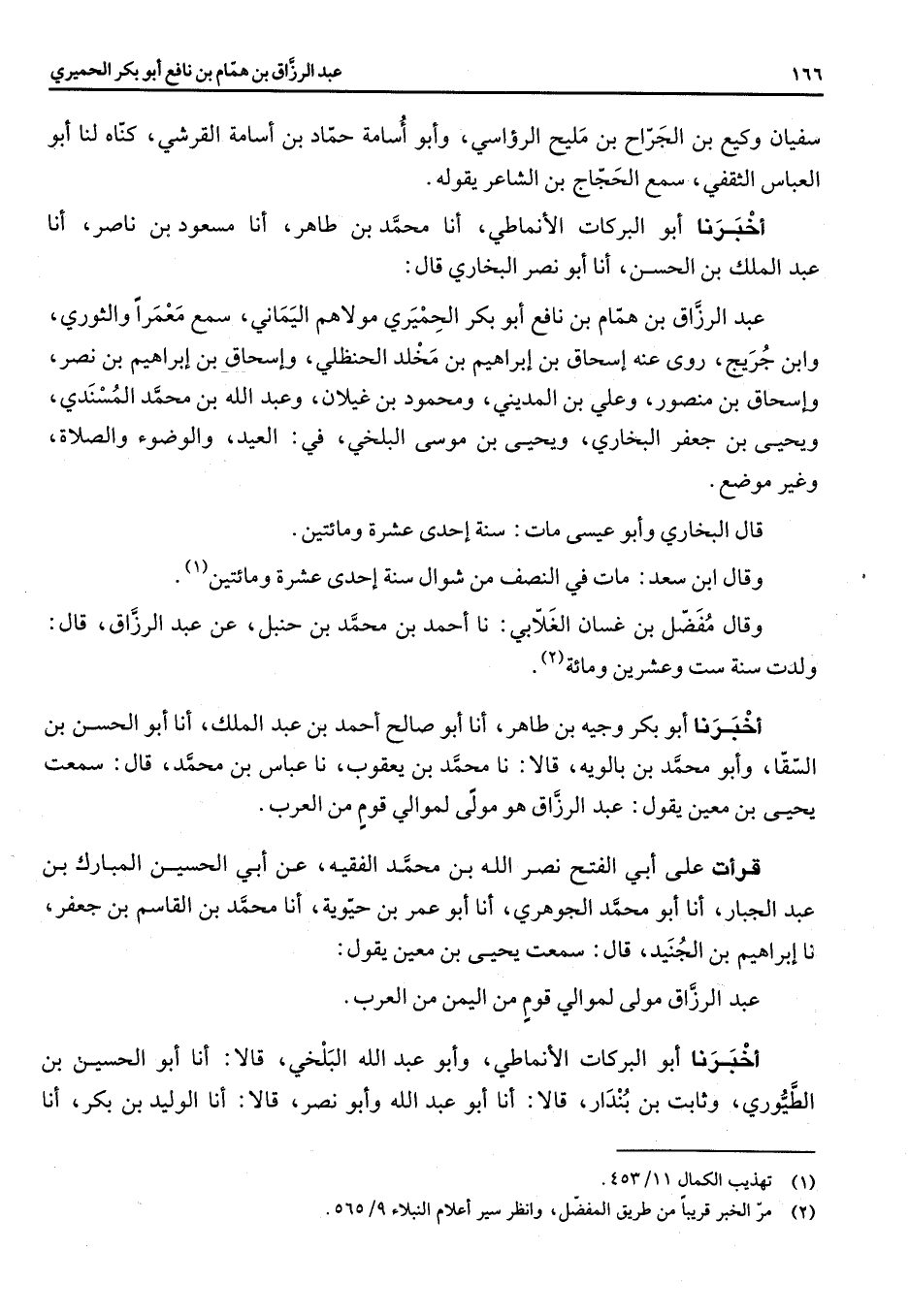 سفيان وكيع بن الجراح بن مليح الرؤاسي وأبو أسامة حماد بن أسامة القرشي كناه لنا أبو العباس الثقفي سمع الحجاج بن الشاعر يقوله اخبرنا أبو البركات الأنماطي أنا محمد بن طاهر أنا مسعود بن ناصر أنا عبد الملك بن الحسن أنا أبو نصر البخاري قال عبد الرزاق بن همام بن نافع أبو بكر الحميري مولاهم اليماني سمع معمرا والثوري وابن جريج روى عنه إسحاق بن إبراهيم بن مخلد الحنظلي وإسحاق بن إبراهيم بن نصر وإسحاق بن منصور وعلي بن المديني ومحمود بن غيلان وعبد الله بن محمد المسندي ويحيى بن جعفر البخاري ويحيى بن موسى البلخي في العيد والوضوء والصلاة وغير موضع قال البخاري وأبو عيسى مات سنة إحدى عشرة ومائتين وقال ابن سعد مات في النصف من شوال سنة إحدى عشرة ومائتين (1) وقال مفضل بن غسان الغلابي نا أحمد بن محمد بن حنبل عن عبد الرزاق قال ولدت سنة ست وعشرين ومائة (2) أخبرنا أبو بكر وجيه بن طاهر أنا أبو صالح أحمد بن عبد الملك أنا أبو الحسن بن السقا وأبو محمد بن بالويه قالا نا محمد بن يعقوب نا عباس بن محمد قال سمعت يحيى بن معين يقول عبد الرزاق هو مولى لموالي قوم من العرب قرأت على أبي الفتح نصر الله بن محمد الفقيه عن أبي الحسين المبارك بن عبد الجبار أنا أبو محمد الجوهري أنا أبو عمر بن حيوية أنا محمد بن القاسم بن جعفر نا إبراهيم بن الجنيد قال سمعت يحيى بن معين يقول عبد الرزاق مولى لموالي قوم من اليمن من العرب اخبرنا أبو البركات الأنماطي وأبو عبد الله البلخي قالا أنا أبو الحسين بن الطيوري وثابت بن بندار قالا أنا أبو عبد الله وأبو نصر قالا أنا الوليد بن بكر أنا