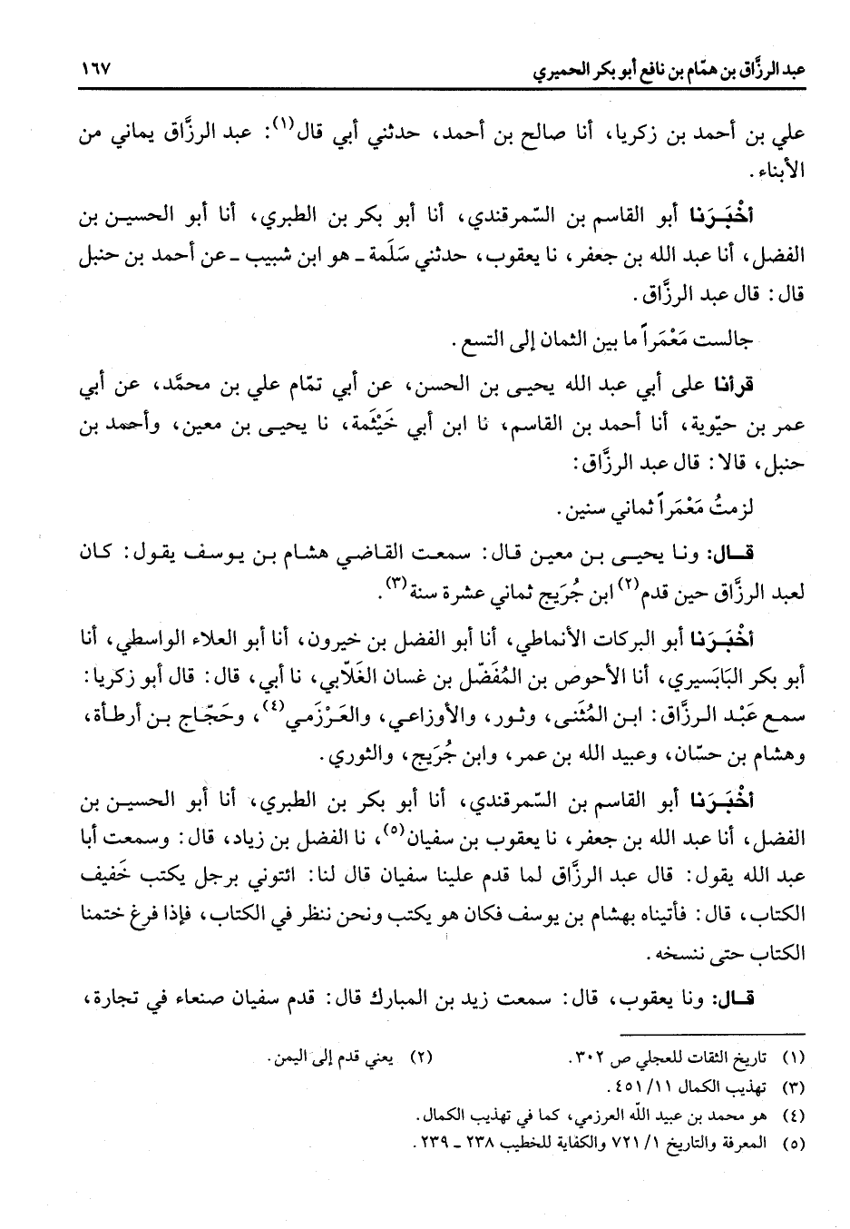علي بن أحمد بن زكريا أنا صالح بن أحمد حدثني أبي قال (1) عبد الرزاق يماني من الأبناء أخبرنا أبو القاسم بن السمرقندي أنا أبو بكر بن الطبري أنا أبو الحسين بن الفضل أنا عبد الله بن جعفر نا يعقوب حدثني سلمة هو ابن شبيب عن أحمد بن حنبل قال قال عبد الرزاق جالست معمرا ما بين الثمان الى التسع قرأنا على أبي عبد الله يحيى بن الحسن عن أبي تمام علي بن محمد عن أبي عمر بن حيوية أنا أحمد بن القاسم نا ابن أبي خيثمة نا يحيى بن معين وأحمد بن حنبل قالا قال عبد الرزاق لزمت معمرا ثماني سنين قال ونا يحيى بن معين قال سمعت القاضي هشام بن يوسف يقول كان لعبد الرزاق حين قدم (2) ابن جريج ثماني عشرة سنة (3) أخبرنا أبو البركات الأنماطي أنا أبو الفضل بن خيرون أنا أبو العلاء الواسطي أنا أبو بكر البابسيري أنا الأحوص بن المفضل بن غسان الغلابي نا أبي قال قال أبو زكريا سمع عبد الرزاق ابن المثنى وثور والأوزاعي والعرزمي (4) وحجاج بن أرطأة وهشام بن حسان وعبيد الله بن عمر وابن جريج والثوري أخبرنا أبو القاسم بن السمرقندي أنا أبو بكر بن الطبري أنا أبو الحسين بن الفضل أنا عبد الله بن جعفر نا يعقوب بن سفيان (5) نا الفضل نا الفضل بن زياد قال وسمعت أبا عبد الله يقول قال عبد الرزاق لما قدم علينا سفيان قال لنا ائتوني برجل يكتب خفيف الكتاب قال فأتيناه بهشام بن يوسف فكان هو يكتب ونحن ننظر في الكتاب فإذا فرغ ختمنا الكتاب حتى ننسخه قال ونا يعقوب قال سمعت زيد بن المبارك قال قدم سفيان صنعاء في تجارة
