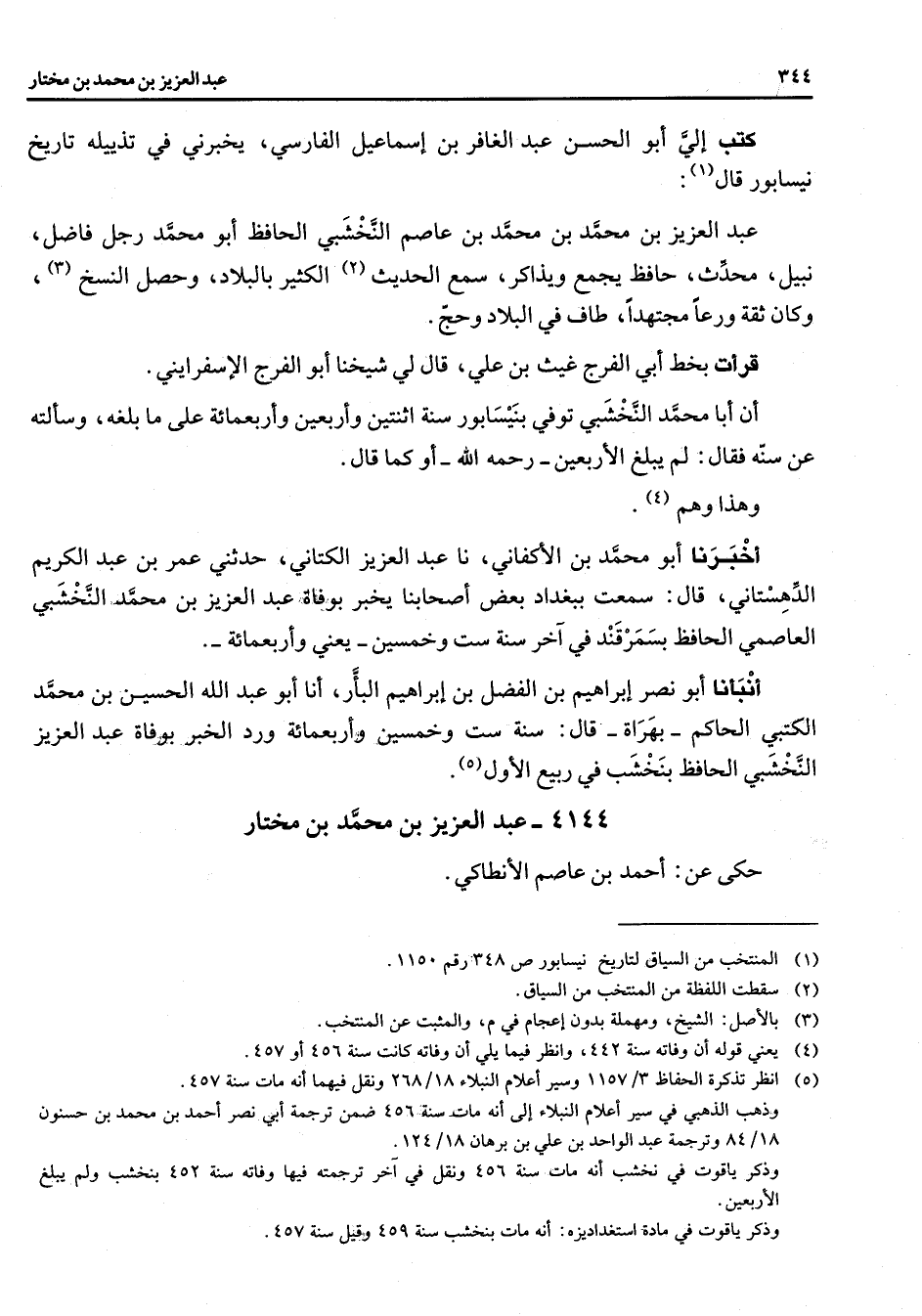 كتب إلي أبو الحسن عبد الغافر بن إسماعيل الفارسي يخبرني في تذييله تاريخ نيسابور قال (1) عبد العزيز بن محمد بن محمد بن عاصم النخشبي الحافظ أبو محمد رجل فاضل نبيل محدث حافظ يجمع ويذاكر سمع الحديث (2) الكثير بالبلاد وحصل النسخ (3) وكان ثقة ورعا مجتهدا طاف في البلاد وحج قرأت بخط أبي الفرج غيث بن علي قال لي شيخنا أبو الفرج الإسفرايني أن أبا محمد النخشبي توفي بنيسابور سنة اثنتين وأربعين وأربعمائة على ما بلغه وسألته عن سنه فقال لم يبلغ الأربعين رحمه الله أو كما قال وهذا وهم (4) أخبرنا أبو محمد بن الأكفاني نا عبد العزيز الكتاني حدثني عمر بن عبد الكريم الدهستاني قال سمعت ببغداد بعض أصحابنا يخبر بوفاة عبد العزيز بن محمد النخشبي العاصمي الحافظ بسمرقند في آخر سنة ست وخمسين يعني وأربعمائة أنبانا أبو نصر إبراهيم بن الفضل بن إبراهيم البأر أنا أبو عبد الله الحسين بن محمد الكتبي الحاكم بهراة قال سنة ست وخمسين وأربعمائة ورد الخبر بوفاة عبد العزيز النخشبي الحافظ بنخشب في ربيع الأول (5) 4144 عبد العزيز بن محمد بن مختار حكى عن أحمد بن عاصم الأنطاكي