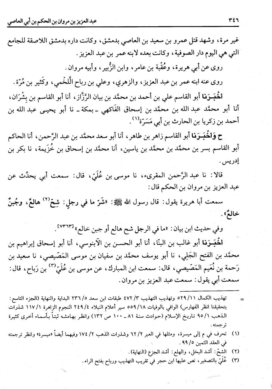 غير مرة وشهد قتل عمرو بن سعيد بن العاصي بدمشق وكانت داره بدمشق اللاصقة للجامع التي هي اليوم دار الصوفية وكانت بعده لابنه عمر بن عبد العزيز روى عن أبي هريرة وعقبة بن عامر وابن الزبير وأبيه مروان روى عنه ابنه عمر بن عبد العزيز والزهري وعلي بن رباح اللخمي وكثير بن مرة أخبرنا أبو القاسم علي بن أحمد بن محمد بن بيان الرزاز أنا أبو القاسم بن بشران أنا أبو محمد عبد الله بن محمد بن إسحاق الفاكهي بمكة نا أبو يحيى عبد الله بن أحمد بن زكريا بن الحارث بن أبي مسرة (1) ح وأخبرنا أبو القاسم زاهر بن طاهر أنا أبو سعد محمد بن عبد الرحمن أنا الحاكم أبو القاسم بسر بن محمد بن محمد بن ياسين أنا محمد بن إسحاق بن خزيمة نا بكر بن إدريس قالا نا عبد الرحمن المقرئ نا موسى بن علي قال سمعت أبي يحدث عن عبد العزيز بن مروان بن الحكم قال سمعت أبا هريرة يقول قال رسول الله (صلى الله عليه وسلم) شر ما في رجل شح (2) هالع وجبن خالع وفى حديث ابن بيان ما في الرجل شح هالع أو جبن خالع