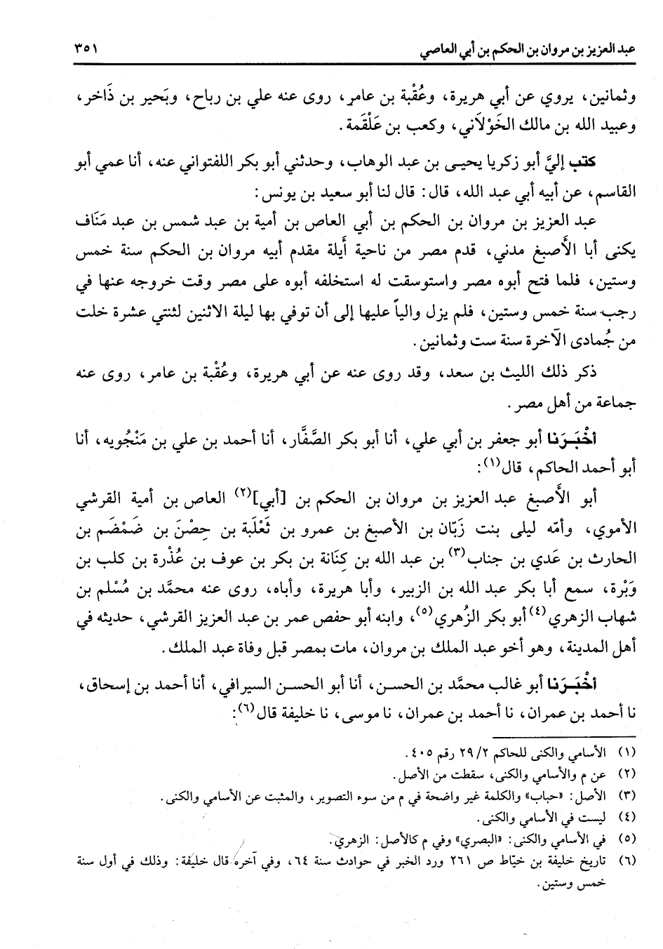 وثمانين يروى عن أبي هريرة وعقبة بن عامر روى عنه علي بن رباح وبحير بن ذاخر وعبيد الله بن مالك الخولاني وكعب بن علقمة كتب إلي أبو زكريا يحيى بن عبد الوهاب وحدثني أبو بكر اللفتواني عنه أنا عمي أبو القاسم عن أبيه أبي عبد الله قال قال لنا أبو سعيد بن يونس عبد العزيز بن مروان بن الحكم بن أبي العاص بن أمية بن عبد شمس بن عبد مناف يكنى أبا الأصبغ مدني قدم مصر من ناحية أيلة مقدم أبيه مروان بن الحكم سنة خمس وستين فلما فتح أبوه مصر واستوسقت له استخلفه أبوه على مصر وقت خروجه عنها في رجب سنة خمس وستين فلم يزل واليا عليها إلى أن توفي بها ليلة الاثنين لثنتي عشرة خلت من جمادى الآخرة سنة ست وثمانين ذكر ذلك الليث بن سعد وقد روى عنه عن أبي هريرة وعقبة بن عامر روى عنه جماعة من أهل مصر أخبرنا أبو جعفر بن أبي علي أنا أبو بكر الصفار أنا أحمد بن علي بن منجويه أنا أبو احمد الحاكم قال (1) : أبو الأصبغ عبد العزيز بن مروان بن الحكم بن أبي (2) العاص بن أمية القرشي الأموي وأمه ليلى بنت زبان بن الأصبغ بن عمرو بن ثعلبة بن حصن بن ضمضم بن الحارث بن عدي بن جناب (3) بن عبد الله بن كنانة بن بكر بن عوف بن عذرة بن كلب بن وبرة سمع أبا بكر عبد الله بن الزبير وأبا هريرة وأباه روى عنه محمد بن مسلم بن شهاب الزهري (4) أبو بكر الزهري (5) وابنه أبو حفص عمر بن عبد العزيز القرشي حديثه في أهل المدينة وهو أخو عبد الملك بن مروان مات بمصر قبل وفاة عبد الملك أخبرنا أبو غالب محمد بن الحسن أنا أبو الحسن السيرافي أنا أحمد بن إسحاق نا أحمد بن عمران نا أحمد بن عمران نا موسى نا خليفة قال (6) :