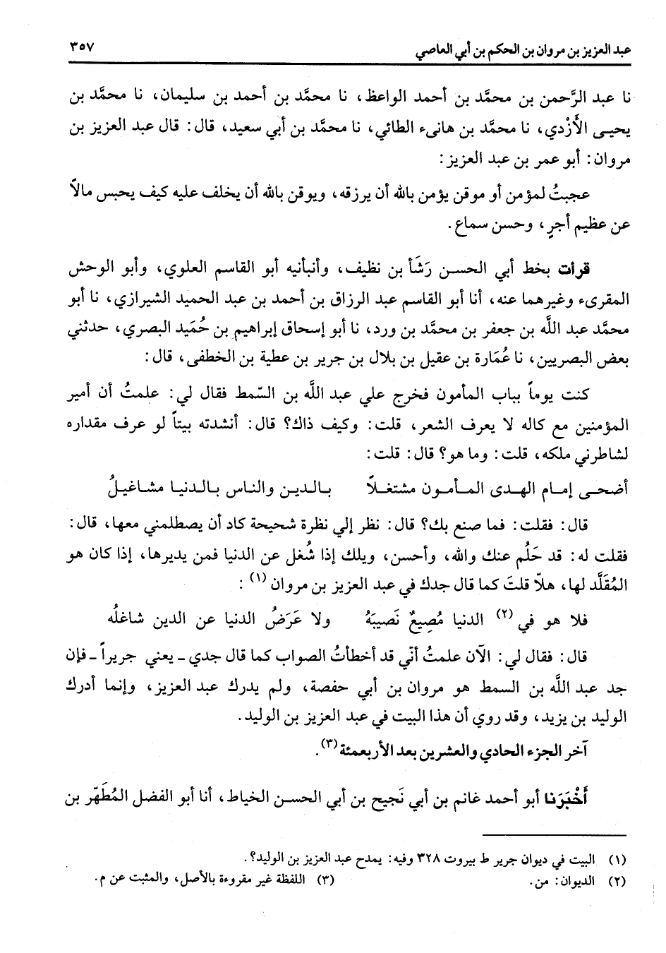 نا عبد الرحمن بن محمد بن أحمد الواعظ نا محمد بن أحمد بن سليمان نا محمد بن يحيى الأزدي نا محمد بن هانئ الطائي نا محمد بن أبي سعيد قال قال عبد العزيز بن مروان أبو عمر بن عبد العزيز عجبت لمؤمن أو موقن يؤمن بالله أن يرزقه ويوقن بالله أن يخلف عليه كيف يحبس مالا عن عظيم أجر وحسن سماع قرأت بخط ابي الحسن رشا بن نظيف وأنبانية أبو القاسم العلوي وابو الوحش المقرئ وغيرهما عنه أنا أبو القاسم عبد الرزاق بن أحمد بن عبد الحميد الشيرازي نا أبو محمد عبد الله بن جعفر بن محمد بن ورد نا أبو إسحاق إبراهيم بن حميد البصري حدثني بعض البصريين نا عمارة بن عقيل بن بلال بن جرير بن عطية بن الخطفى قال كنت يوما بباب المأمون فخرج علي عبد الله بن السمط فقال لى علمت أن أمير المؤمنين مع كاله لا يعرف الشعر قلت وكيف ذاك قال أنشدته بيتا لو عرف مقداره لشاطرني ملكه قلت وما هو قال قلت أضحى إمام الهدى المأمون مشتغلا * بالدين والناس بالدنيا مشاغيل * قال فقلت فما صنع بك قال نظر إلي نظرة شحيحة كاد أن يصطلمني معها قال فقلت له قد حلم عنك والله وأحسن ويلك إذا شغل عن الدنيا فمن يديرها إذا كان هو المقلد لها هلا قلت كما قال جدك في عبد العزيز بن مروان (1) : * فلا هو في (2) الدنيا مصيع نصيبه * ولا عرض الدنيا عن الدين شاغله * قال فقال لي الآن علمت أني قد أخطات الصواب كما قال جدي يعني جريرا فإن جد عبد الله بن السمط هو مروان بن أبي حفصة ولم يدرك عبد العزيز وإنما أدرك الوليد بن يزيد وقد روي أن هذا البيت في عبد العزيز بن الوليد آخر الجزء الحادي والعشرين بعد الأربعمئة (3) أخبرنا أبو أحمد غانم بن أبي نجيح بن أبي الحسن الخياط أنا أبو الفضل المطهر بن