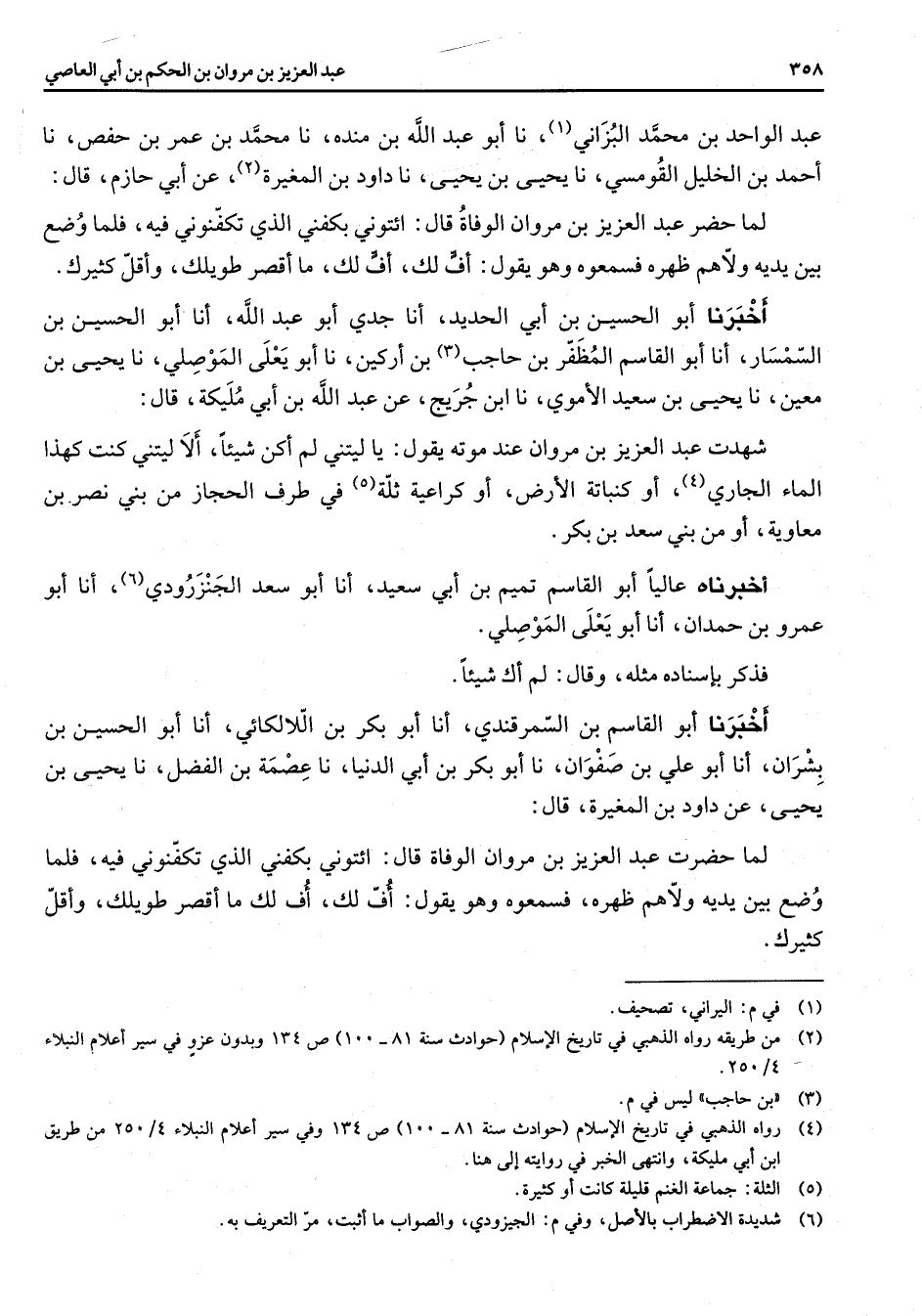 عبد الواحد بن محمد البزاني (1) نا أبو عبد الله بن منده نا محمد بن عمر بن حفص نا أحمد بن الخليل القومسي نا يحيى بن يحيى نا داود بن المغيرة (2) عن أبي حازم قال لما حضر عبد العزيز بن مروان الوفاة قال ائتوني بكفني الذي تكفوني فيه فلما وضع بين يديه ولاهم ظهره فسمعوه وهو يقول أف لك ما أقصر طويلك وأقل كثيرك أخبرنا أبو الحسين بن أبي الحديد أنا جدي أبو عبد الله أنا أبو الحسين بن السمسار أنا أبو القاسم المظفر بن حاجب (3) بن أركين نا أبو يعلى الموصلي نا يحيى بن معين نا يحيى بن سعيد الأموي نا ابن جريج عن عبد الله بن أبي مليكه قال شهدت عبد العزيز بن مروان عند موته يقول يا ليتني لم أكن شيئا ألا ليتنى كنت كهذا الماء الجاري (4) أو كنباته الأرض أو كراعية ثلة (5) في طرف الحجاز من بني نصر بن معاوية أو بني سعد بن بكر أخبرناه عاليا أبو القاسم تميم بن أبي سعيد أنا أبو سعد الجنزرودي (6) أنا أبو عمرو بن حمدان أنا أبو يعلي الموصلي فذكر بإسناده مثله وقال لم أك شيئا أخبرنا أبو القاسم بن السمرقندي أنا أبو بكر بن اللالكائي أنا أبو الحسن بن بشران أنا أبو علي بن صفوان نا أبو بكر بن أبي الدنيا نا عصمة بن الفضل نا يحيى بن يحيى عن داود بن المغيرة قال لما حضرت عبد العزيز بن مروان الوفاة قال ائتوني بكفني الذي تكفنوني فيه فلما وضع بين يديه ولاهم ظهره فسمعوه وهو يقول أف لك ما أقصر طويلك وأقل كثيرك
