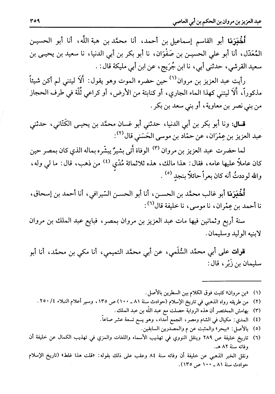 أخبرنا أبو القاسم إسماعيل بن أحمد أنا محمد بن هبة الله أنا أبو الحسين المعدل أنا أبو علي الحسين بن صفوان نا أبو بكر بن أبي الدنيا نا سعيد بن يحيى بن سعيد القرشي حدثنى أبي نا ابن جريج عن ابن أبي مليكة قال: رأيت عبد العزيز بن مروان (1) حين حضره الموت وهو يقول ألا ليتنى لم أكن شيئا مذكورا ألا ليتني كهذا الماء الجاري أو كنابته من الأرض أو كراعي ثلة في طرف الحجاز من بني نصر بن معاوية أو بني سعد بن بكر قال ونا أبو بكر بن أبي الدنيا حدثني أبو غسان محمد بن يحيى الكتاني حدثني عبد العزيز بن عمران عن حماد بن موسى الحسني قال (2) لما حضرت عبد العزيز بن مروان (3) الوفاة أتى بشير يبشره بماله الذي كان بمصر حين كان عاملا عليها عامة فقال هذا مالك هذه ثلاثمائة مدي (4) من ذهب قال ما لي وله والله لوددت أنه كان بعرا حائلا بنجد (5) أخبرنا أبو غالب محمد بن الحسن أنا أبو الحسن السيرافي أنا أحمد بن إسحاق نا أحمد بن عمران نا موسى نا خليفة قال (6) : سنة أربع وثمانين فيها مات عبد العزيز بن مروان بمصر فبايع عبد الملك بن مروان لابنيه الوليد وسليمان قرأت على أبي محمد السلمى عن أبي محمد التميمي أنا مكي بن محمد أنا أبو سليمان بن زبر قال: