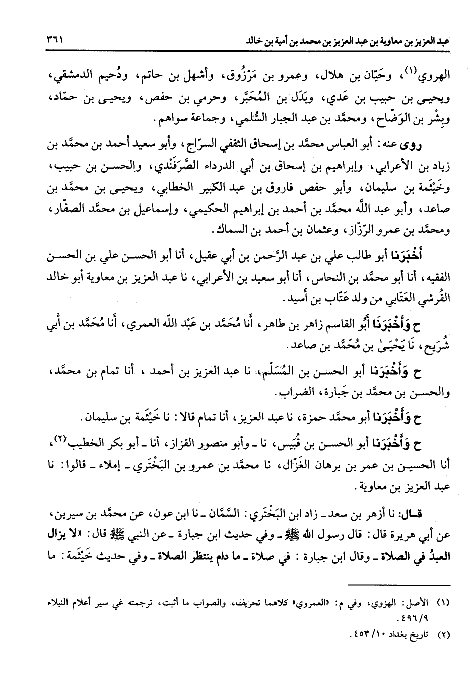 الهروي (1) وحيان بن هلال وعمرو بن مرزوق وأشهل بن حاتم ودحيم الدمشقي ويحيى بن حبيب بن عدي وبدل بن المحبر وحرمي بن حفص ويحيى بن حماد وبشر بن الوضاح ومحمد بن عبد الجبار السلمي وجماعة سواهم روى عنه أبو العباس محمد بن إسحاق الثقفي السراج وأبو سعيد أحمد بن محمد بن زياد بن الأعرابي وإبراهيم بن إسحاق بن أبي الدرداء الصرفندي والحسن بن حبيب وخيثمة بن سليمان وأبو حفص فاروق بن عبد الكبير الخطابي ويحيى بن محمد بن صاعد وأبو عبد الله محمد بن أحمد بن إبراهيم الحكيمي وإسماعيل بن محمد الصفار ومحمد بن عمرو الرزاز وعثمان بن أحمد بن السماك أخبرنا أبو طالب علي بن عبد الرحمن بن أبي عقيل أنا أبو الحسن علي بن الحسن الفقيه أنا أبو محمد بن النحاس أنا أبو سعيد بن الأعرابي نا عبد العزيز بن معاوية أبو خالد القرشي العتابي من ولد عتاب بن أسيد ح وأخبرنا أبو القاسم زاهر بن طاهر أنا محمد بن عبد الله العمري أنا محمد بن أبي شريح نا يحيى بن محمد بن صاعد ح وأخبرنا أبو الحسن بن المسلم نا عبد العزيز بن أحمد أنا تمام بن محمد والحسن بن محمد بن جبارة الضراب ح وأخبرنا أبو محمد حمزة نا عبد العزيز أنا تمام قالا نا خثيمة بن سليمان ح وأخبرنا أبو الحسن بن قبيس نا وأبو منصور القزاز أنا أبو بكر الخطيب (2) أنا الحسين بن عمر بن برهان الغزال نا محمد بن عمرو بن البختري إملاء قالوا نا عبد العزيز بن معاوية قال نا أزهر بن سعد زاد ابن البختري السمان نا ابن عون عن محمد بن سيرين عن أبي هريرة قال قال رسول الله (صلى الله عليه وسلم) وفى حديث ابن جبارة عن النبي (صلى الله عليه وسلم) قال لا يزال العبد في الصلاة وقال ابن جبارة في صلاة ما دام ينتظر الصلاة وفى حديث خيثمة ما