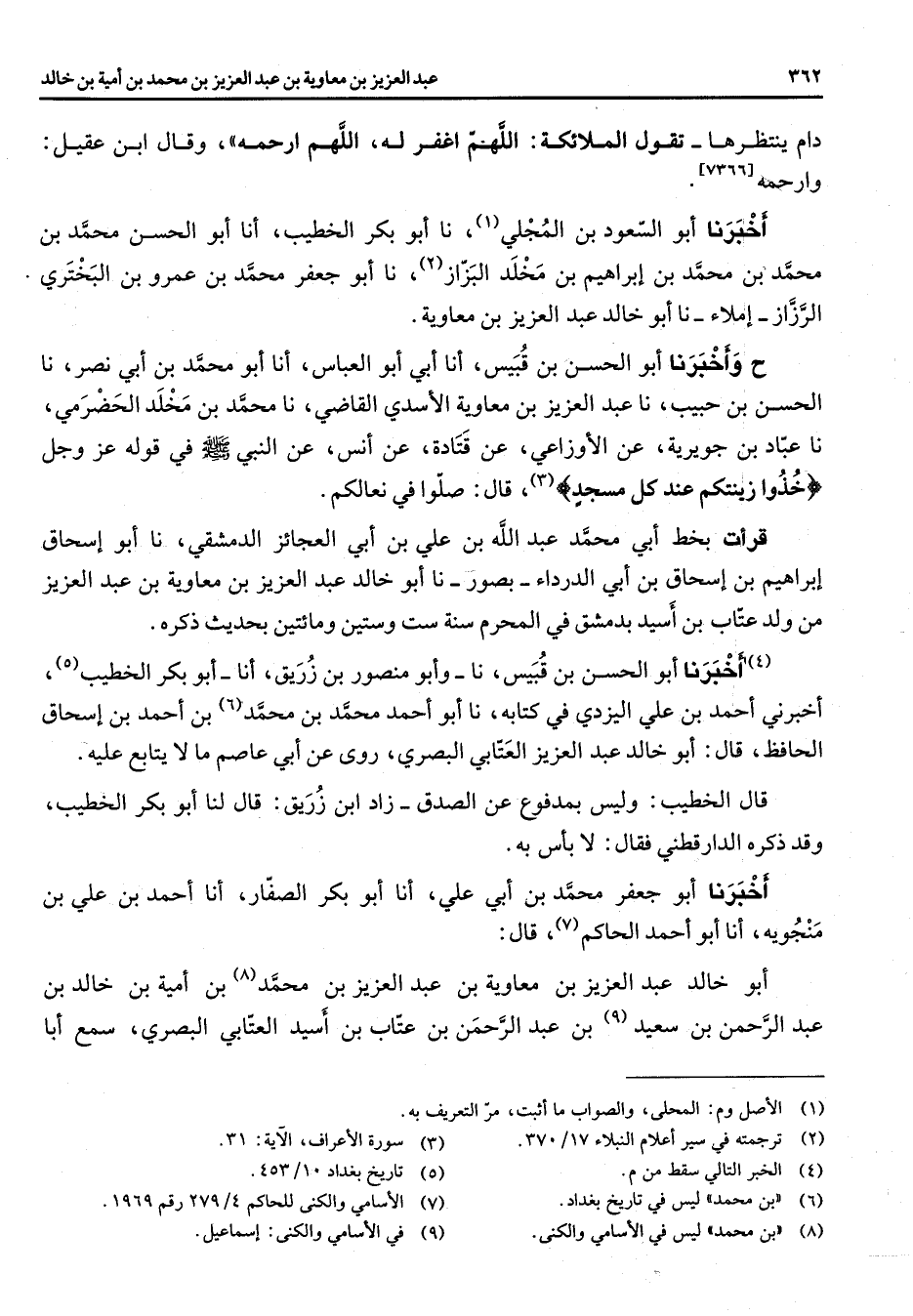 [7366] أخبرنا أبو السعود بن المجلي (1) نا أبو بكر الخطيب أنا أبو الحسن محمد بن محمد بن محمد بن إبراهيم بن مخلد البزاز (2) نا أبو جعفر محمد بن عمرو بن البختري الرزاز إملاء نا أبو خالد عبد العزيز بن معاوية ح وأخبرنا أبو الحسن بن قبيس أنا أبي أبو العباس أنا أبو محمد بن أبي نصر نا الحسن بن حبيب نا عبد العزيز بن معاوية الأسدي القاضي نا محمد بن مخلد الحضرمي نا عباد بن جويرية عن الأوزاعي عن قتادة عن أنس عن النبي (صلى الله عليه وسلم) في قوله عز وجل " خذوا زينتكم عند كل مسجد " (3) قال صلوا في نعالكم قرأت بخط أبي محمد بن عبد الله بن علي بن أبي العجائز الدمشقي نا أبو إسحاق إبراهيم بن إسحاق بن أبي الدرداء بصور نا أبو خالد عبد العزيز بن معاوية بن عبد العزيز من ولد عتاب بن أسيد بدمشق في المحرم سنة ست وستين ومائتين بحديث ذكره (4) أخبرنا أبو الحسن بن قبيس نا وأبو منصور بن زريق أنا أبو بكر الخطيب (5) أخبرني أحمد بن علي اليزدي في كتابة نا أبو أحمد محمد بن محمد (6) بن أحمد بن إسحاق الحافظ قال أبو خالد عبد العزيز العتابي البصري روى عن أبي عاصم ما لا يتابع عليه قال الخطيب وليس بمدفوع عن الصدق زاد ابن زريق قال لنا أبو بكر الخطيب وقد ذكره الدارقطني فقال لا بأس به أخبرنا أبو جعفر محمد بن أبي علي أنا أبو بكر الصفار أنا أحمد بن علي بن منجويه أنا أبو احمد الحاكم (7) قال أبو خالد عبد العزيز بن معاوية بن عبد العزيز بن محمد (8) بن أمية بن خالد بن عبد الرحمن بن سعيد (9) بن عبد الرحمن بن عتاب بن أسيد العتابي البصري سمع أبا
