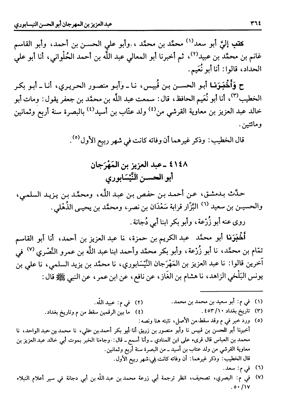 4148 - عبد العزيز بن المهرجان أبو الحسن النيسابوري حدث بدمشق عن أحمد بن حفص بن عبد الله ومحمد بن يزيد السلمي والحسين بن سعيد (6) البزار قرابة سعدان بن نصر ومحمد بن يحيى الذهلي روى عنه أبو زرعة وابو بكر ابنا أبي دجانة أخبرنا أبو محمد عبد الكريم بن حمزة نا عبد العزيز بن أحمد أنا أبو القاسم تمام بن محمد نا أبو زرعة وأبو بكر محمد وأحمد ابنا عبد الله بن عمرو النصري (7) في آخرين قالوا نا عبد العزيز بن المهرجان النيسابوري نا محمد بن يزيد السلمي نا علي بن يونس البلخي الزاهد نا هشام بن الغاز عن نافع عن ابن عمر عن النبي (صلى الله عليه وسلم) قال
