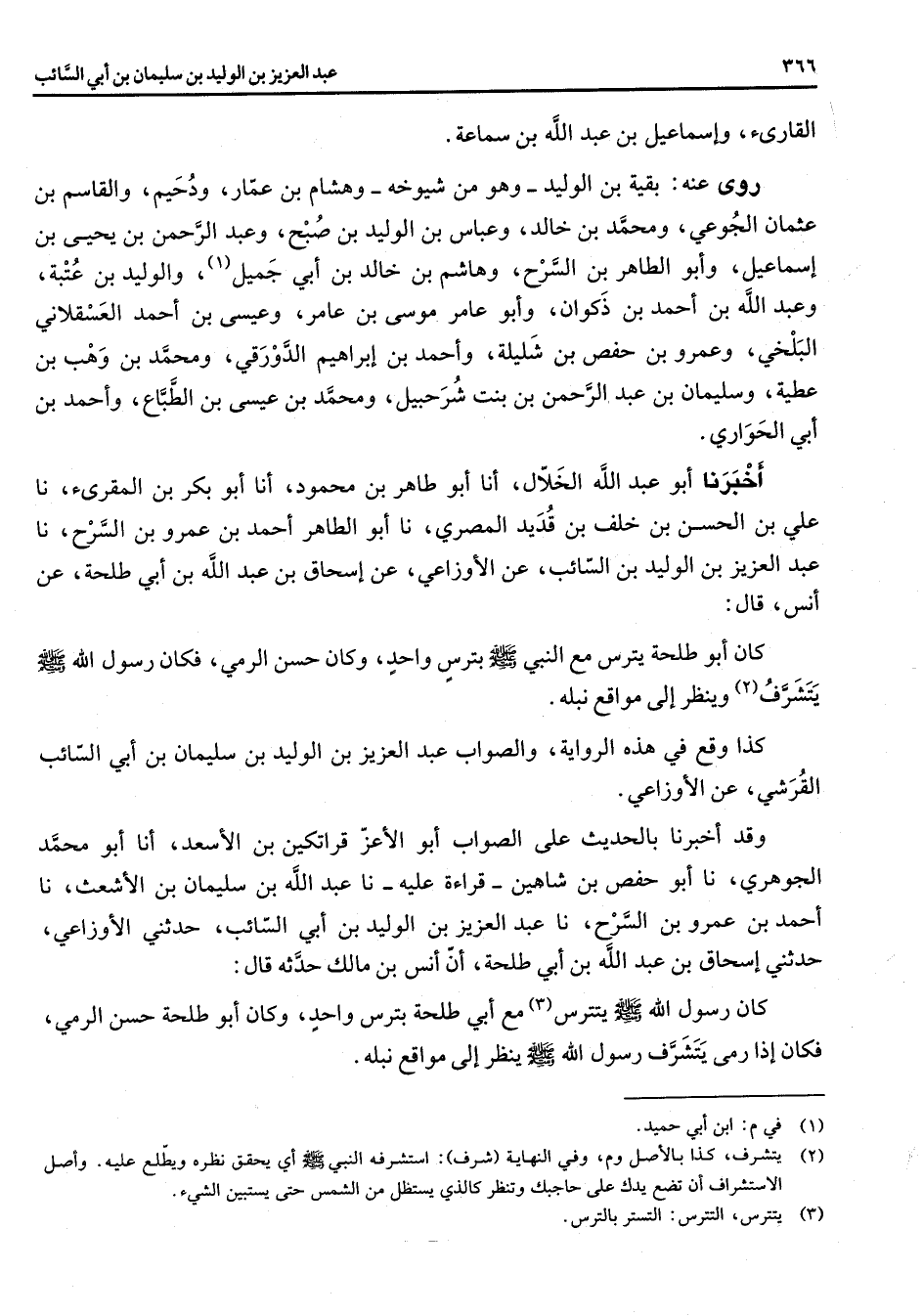 القارئ وإسماعيل بن عبد الله بن سماعة روى عنه بقية بن الوليد وهو من شيوخه وهشام بن عمار ودحيم والقاسم بن عثمان الجوعي ومحمد بن خالد وعباس بن الوليد بن صبح وعبد الرحمن بن يحيى بن إسماعيل وأبو الطاهر بن السرح وهاشم بن خالد بن أبي جميل (1) والوليد بن عتبة وعبد الله بن أحمد بن ذكوان وأبو عامر موسى بن عامر وعيسى بن أحمد العسقلاني البلخي وعمرو بن حفص بن شليلة وأحمد بن إبراهيم الدورقي ومحمد بن وهب بن عطية وسليمان بن عبد الرحمن بن بنت شرحبيل ومحمد بن عيسى بن الطباع وأحمد بن أبي الحواري أخبرنا أبو عبد الله الخلال أنا أبو طاهر بن محمود أنا أبو بكر بن المقرئ نا علي بن الحسن بن خلف بن قديد المصري نا أبو الطاهر أحمد بن عمرو بن السرح نا عبد العزيز بن الوليد بن السائب عن الأوزاعي عن إسحاق بن عبد الله بن أبي طلحة عن أنس قال كان أبو طلحة يترس مع النبي (صلى الله عليه وسلم) بترس واحد وكان حسن الرمي فكان رسول الله (صلى الله عليه وسلم) يتشرف (2) وينظر إلى مواقع نبله كذا وقع في هذه الرواية والصواب عبد العزيز بن الوليد بن سليمان بن أبي السائب القرشي عن الأوزاعي وقد أخبرنا بالحديث على الصواب أبو الأعز قراتكين بن الأسعد أنا أبو محمد الجوهري نا أبو حفص بن شاهين قراءة عليه نا عبد الله بن سليمان بن الأشعث نا أحمد بن عمرو بن السرح نا عبد العزيز بن الوليد بن أبي السائب حدثني الأوزاعي حدثني إسحاق بن عبد الله بن أبي طلحة أن أنس بن مالك حدثه قال كان رسول الله (صلى الله عليه وسلم) يتترس (3) مع أبي طلحة بترس واحد وكان أبو طلحة حسن الرمي فكان إذا رمى يتشرف رسول الله (صلى الله عليه وسلم) ينظر إلى مواقع نبله