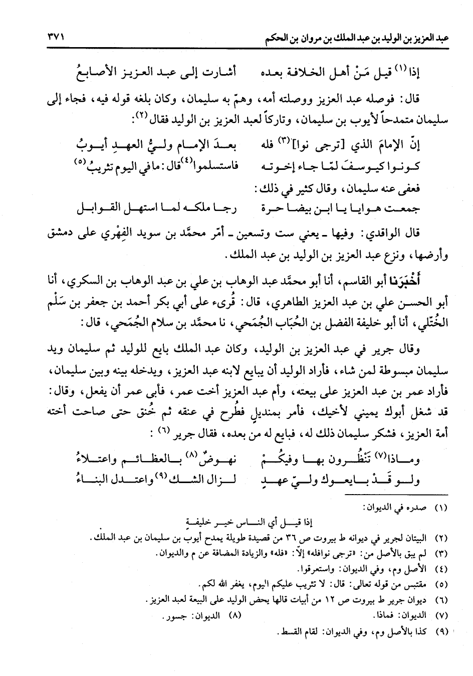 (6) ديوان جرير ط بيروت ص 12 من أبيات قالها يحض الوليد على البيعة لعبد العزيز
